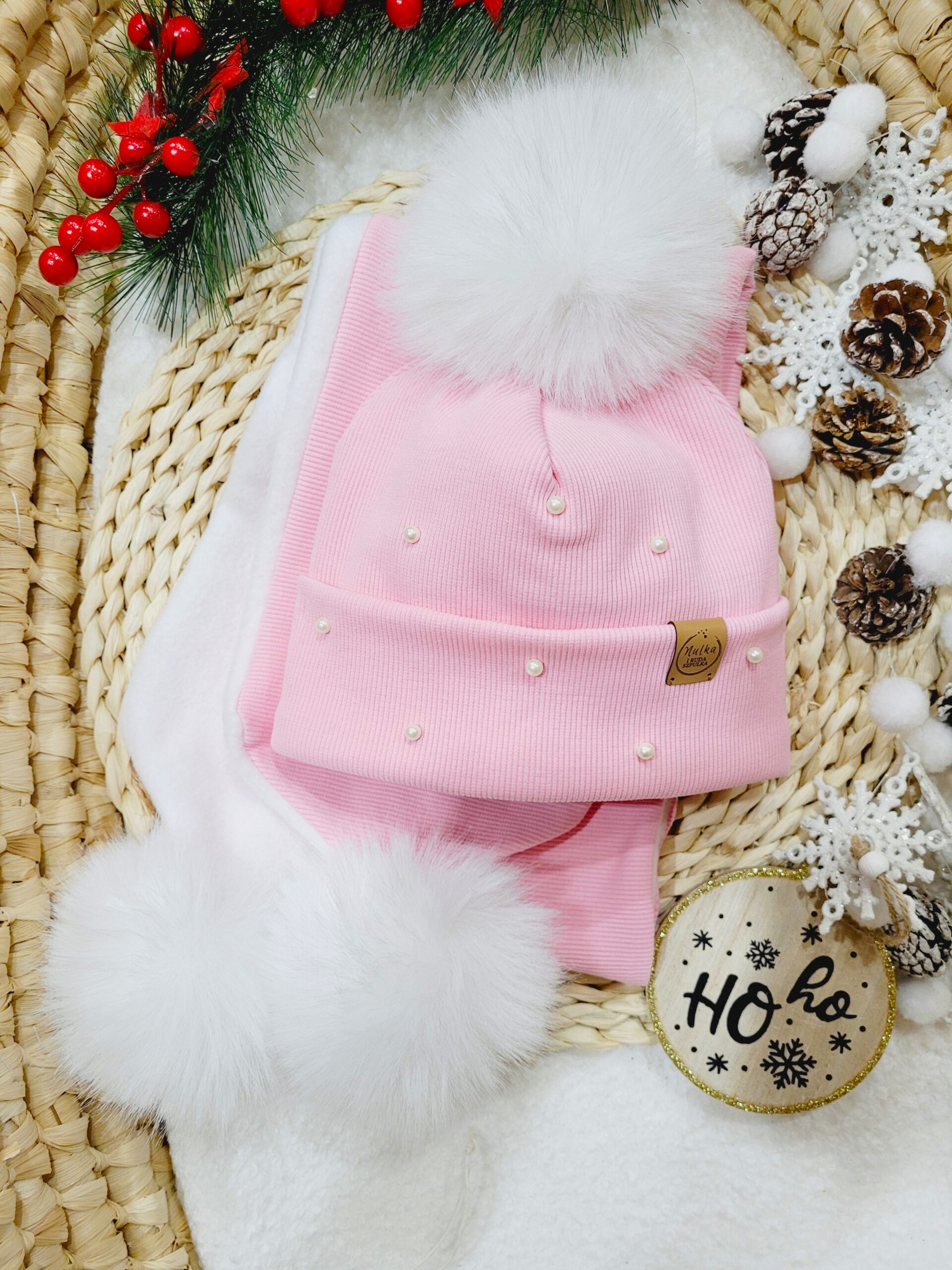 Czapka z szalikiem, chustą lub kominem w wybranym kolorze ozdobiona perełkami i pięknymi ręcznie robionymi pomponami w różnych kolorach do wyboru. Rozmiar od 36 do 54.