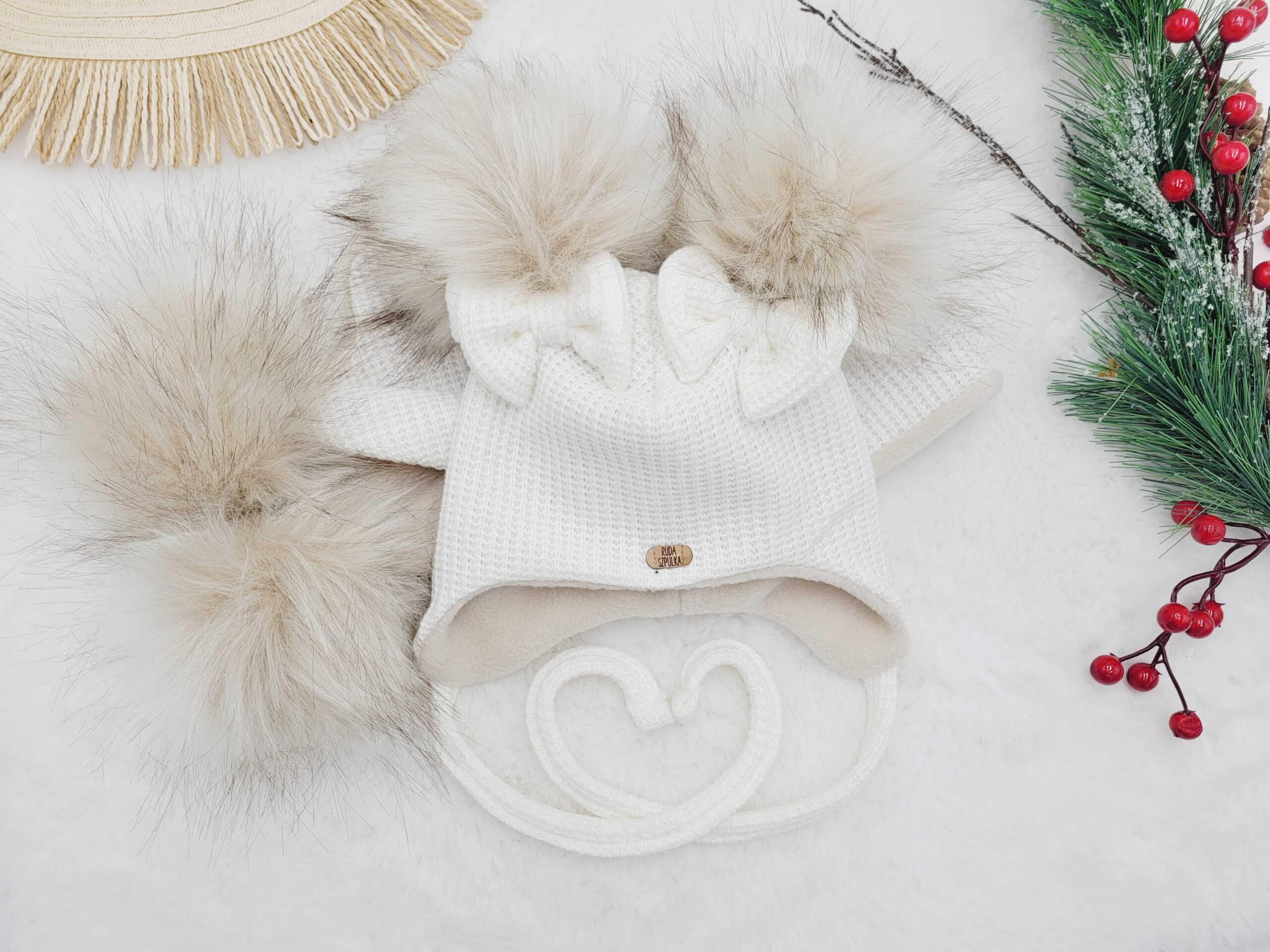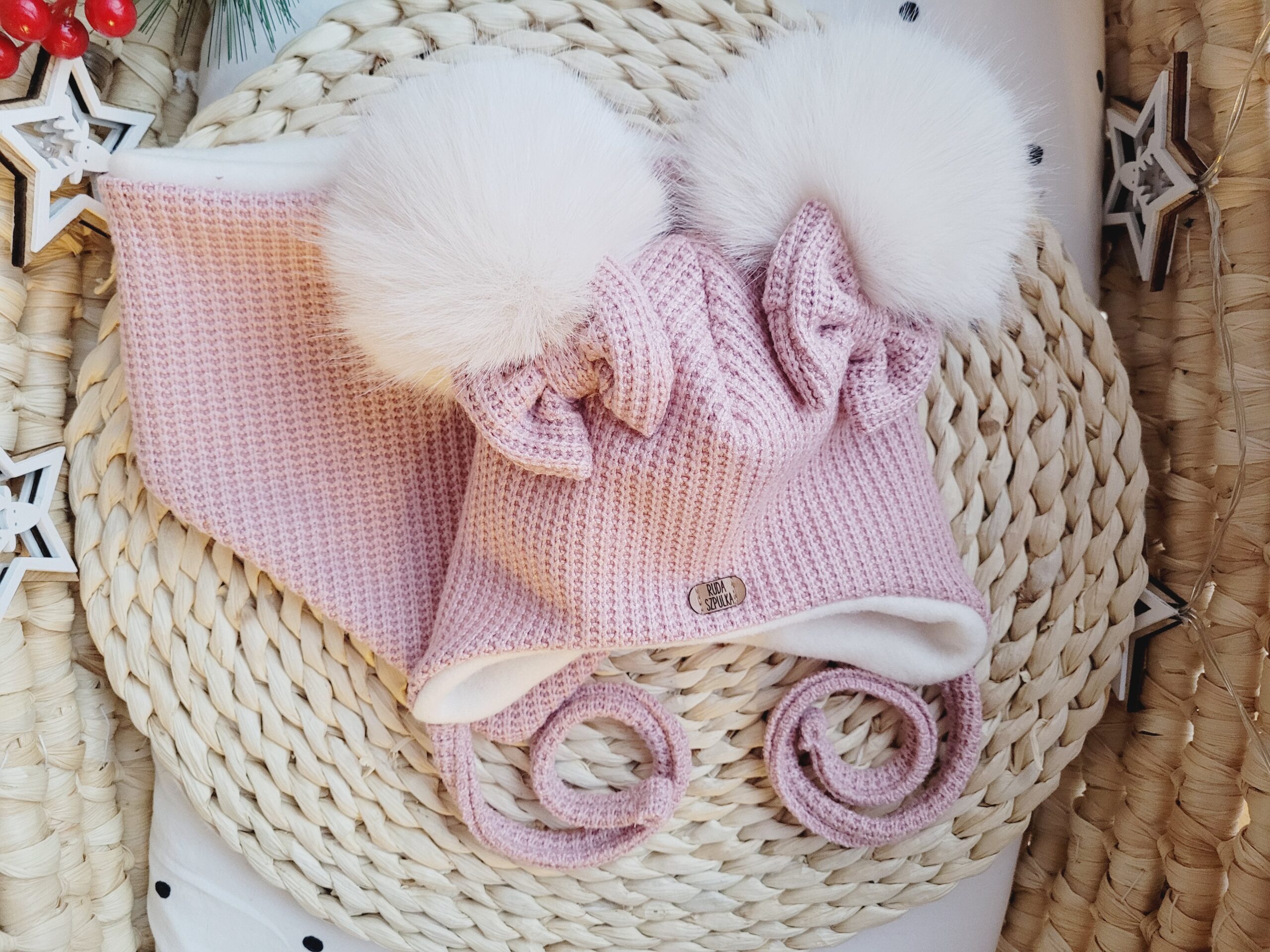 Komplet zawiera wiązaną czapkę pilotkę, ozdobioną ręcznie robionymi pomponami i kokardkami w kolorze dzianiny. Możesz wybrać inny kolor pomponów – wystarczy, że dodasz notatkę do zamówienia.