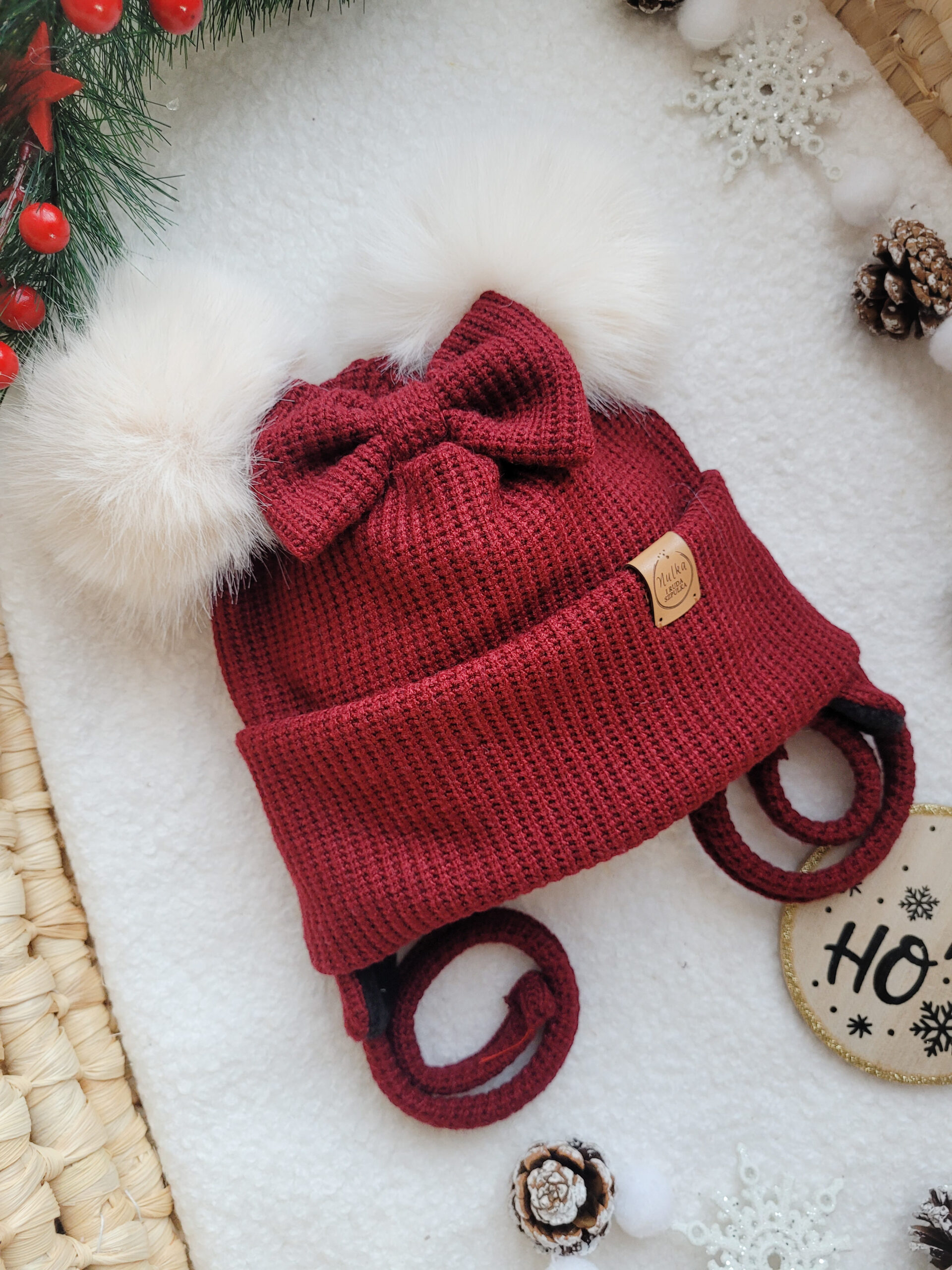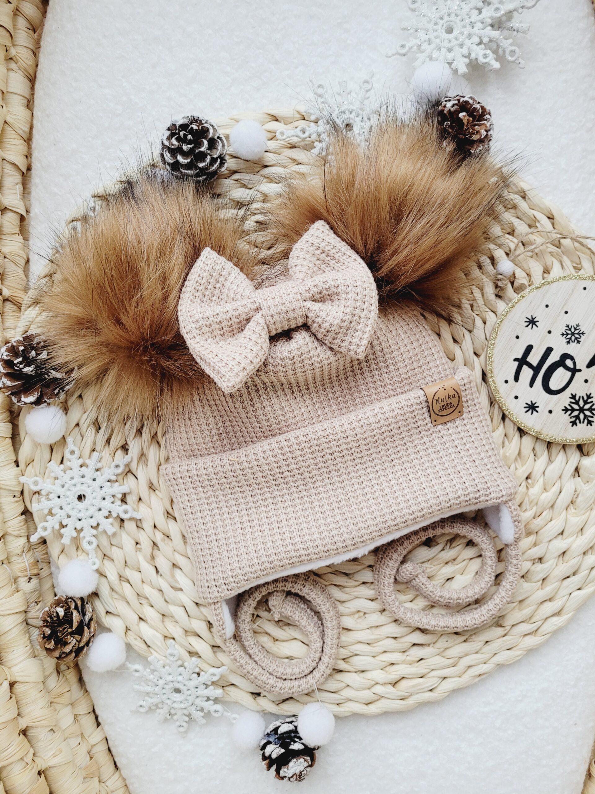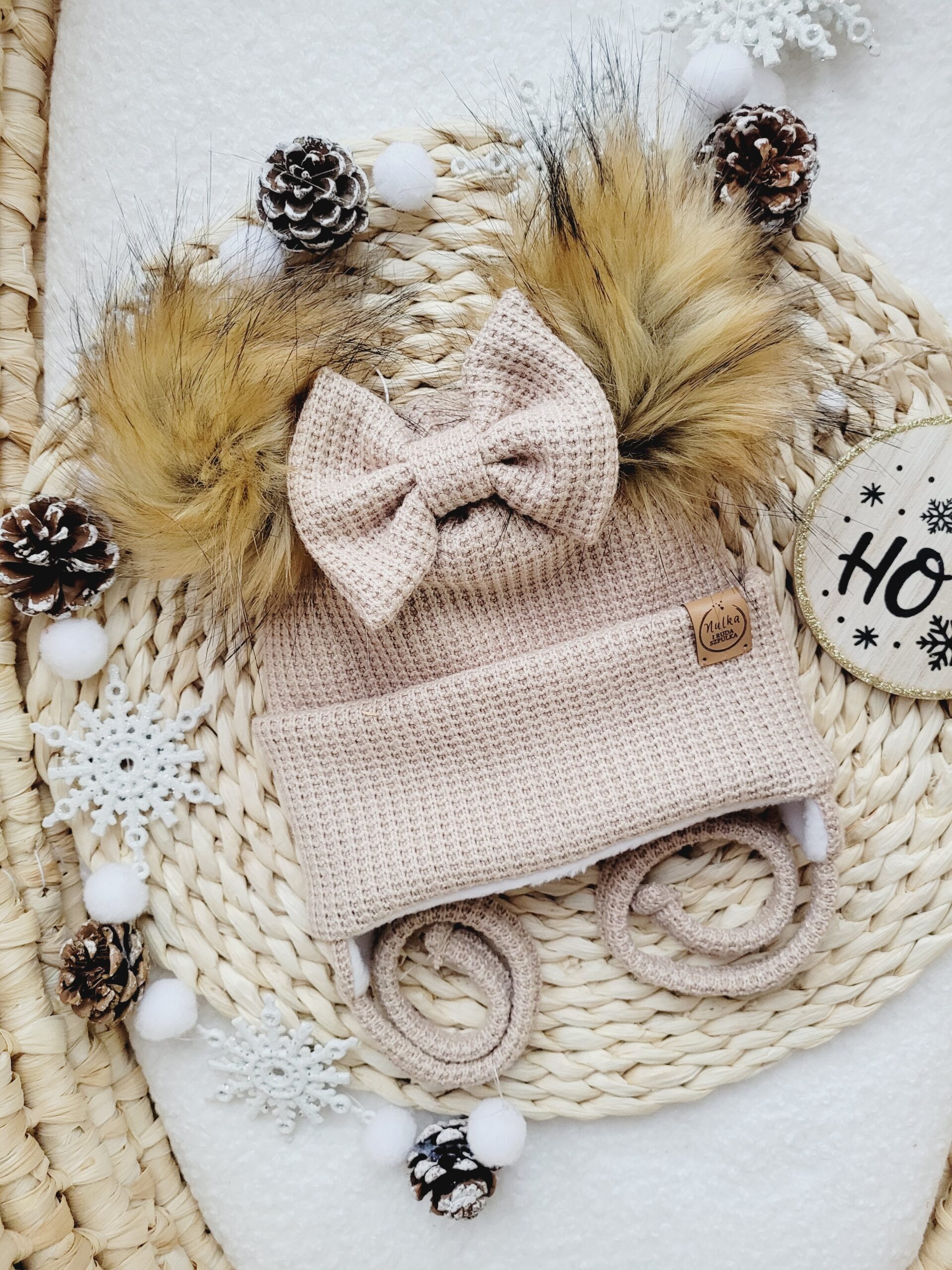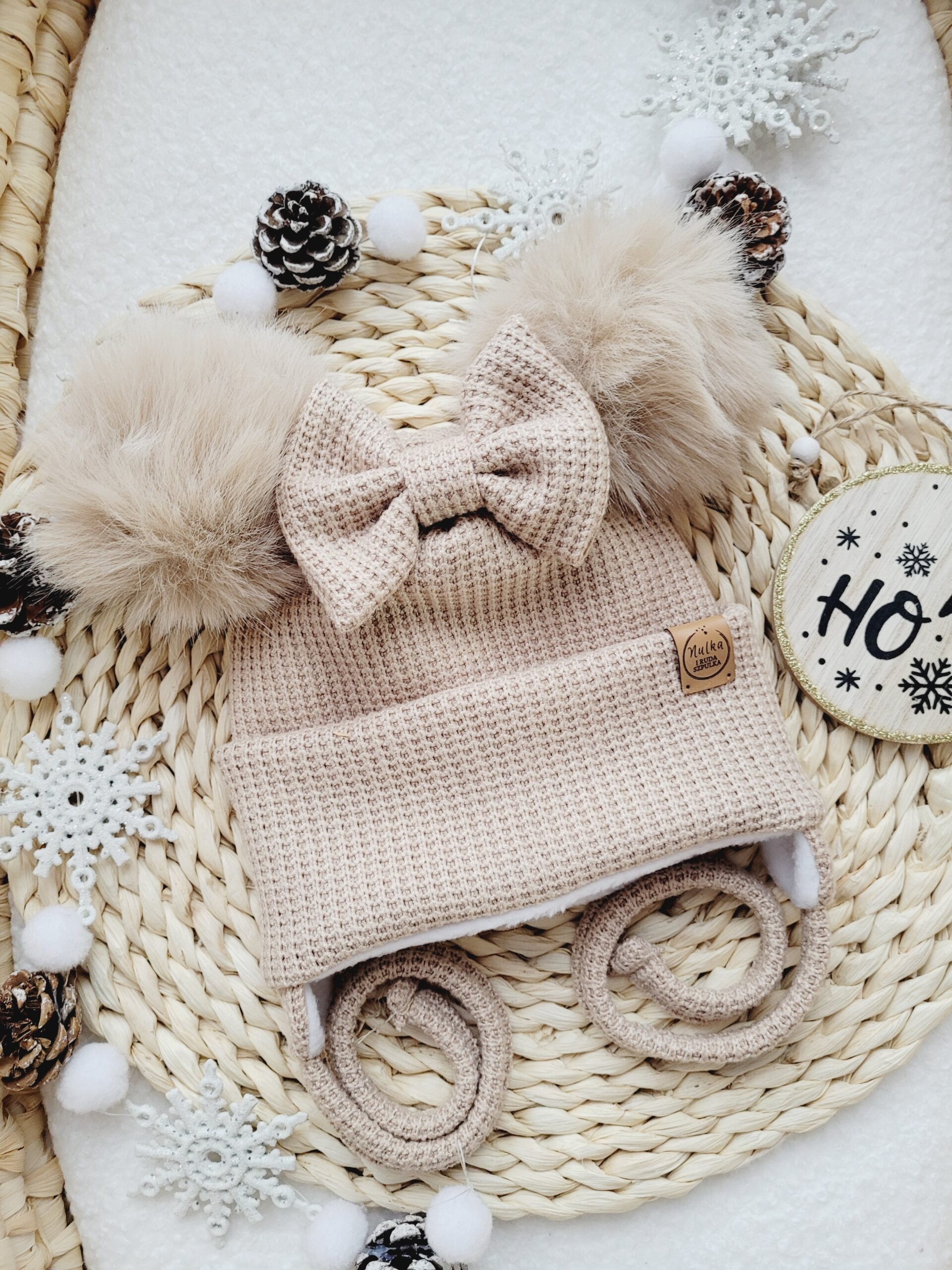 Czapka dostępna jest w dwóch wariantach: prosta lub z wywinięciem. Możesz dobrać do niej ręcznie robione pompony oraz kokardkę. Jeśli chcesz kokardka może mieć inny kolor. Opcja z wiązaniem sprawdzi się szczególnie u niemowląt i młodszych dzieci.