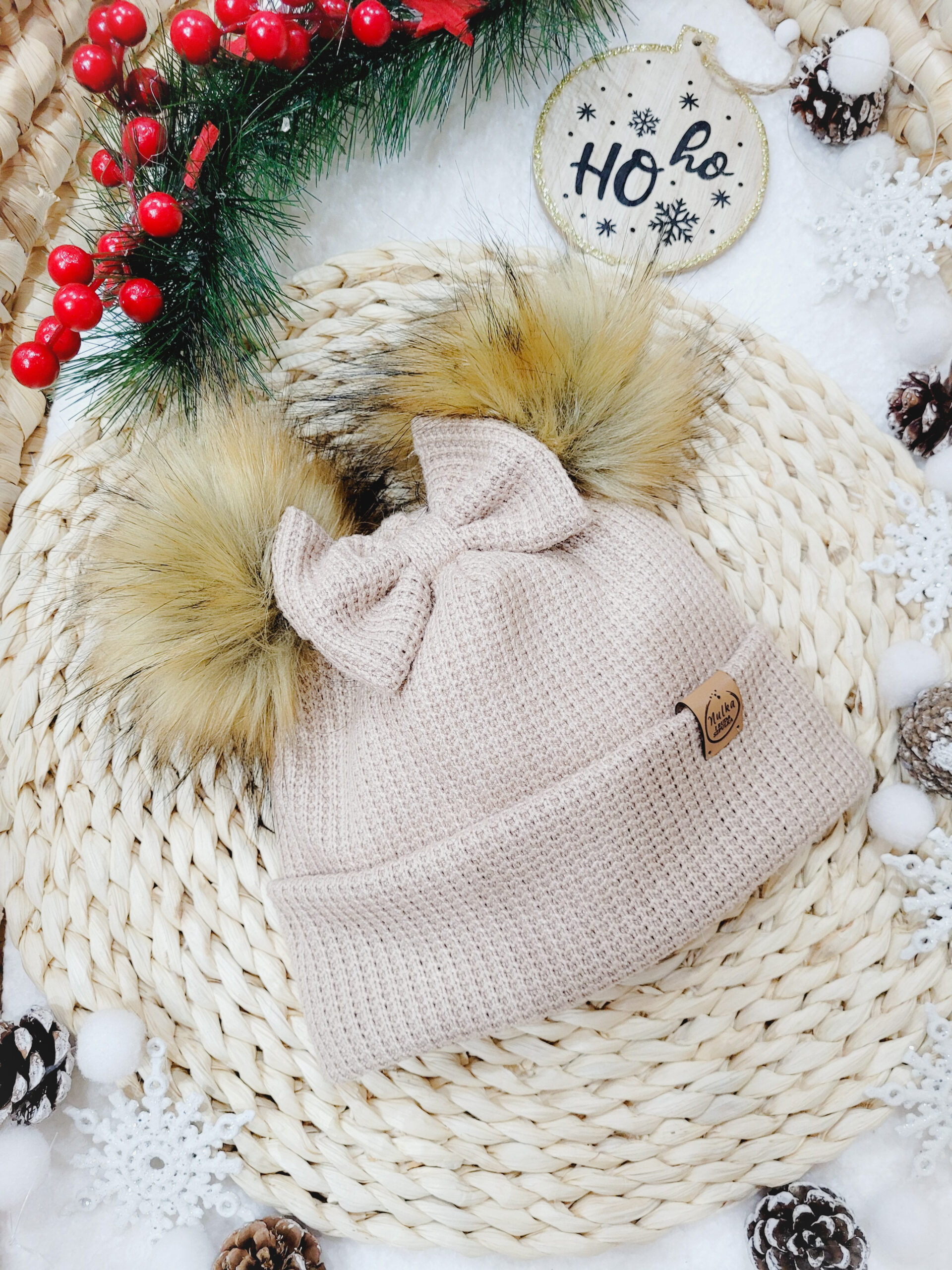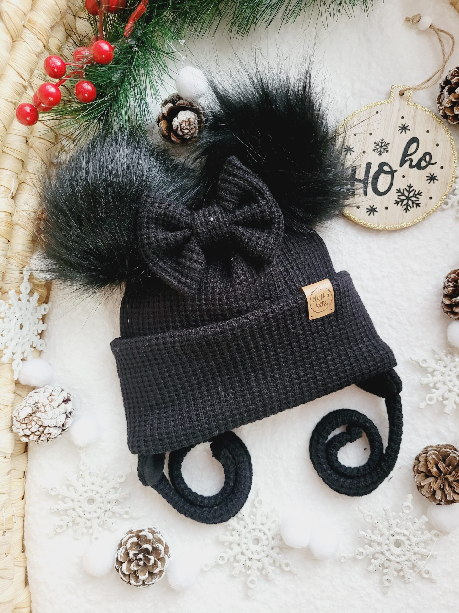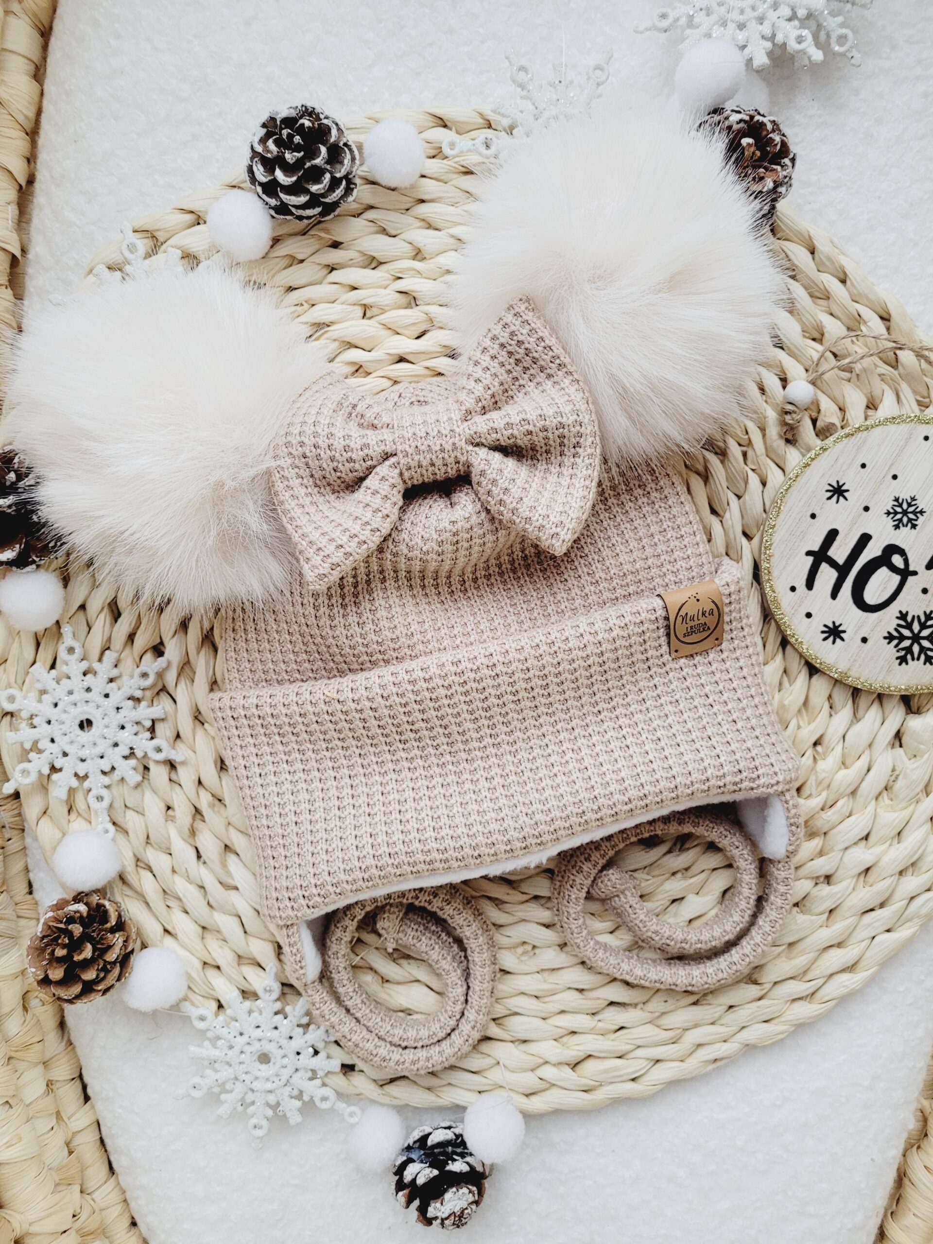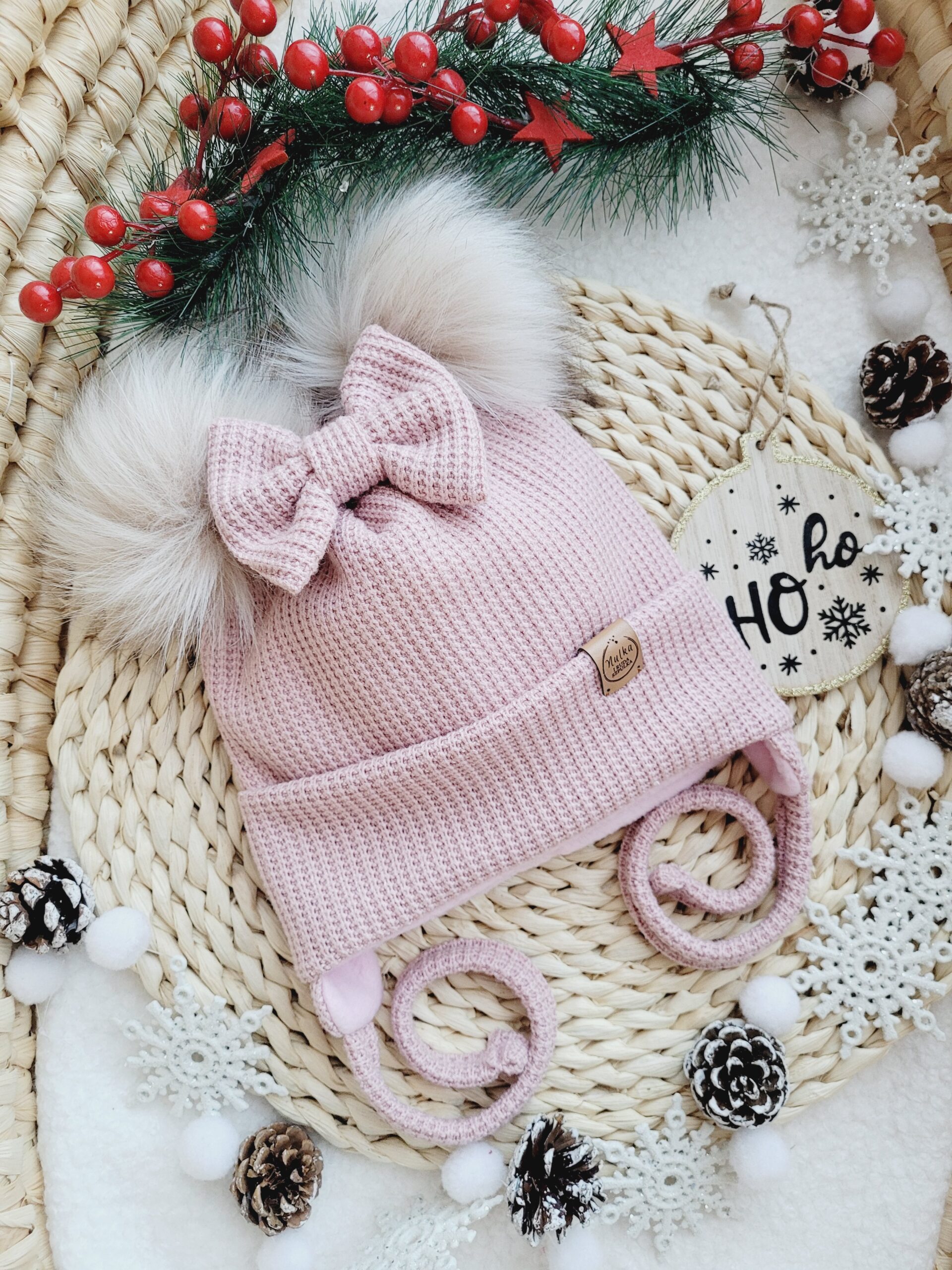 Czapka dostępna jest w dwóch wariantach: prosta lub z wywinięciem. Możesz dobrać do niej ręcznie robione pompony oraz kokardkę. Jeśli chcesz kokardka może mieć inny kolor. Opcja z wiązaniem sprawdzi się szczególnie u niemowląt i młodszych dzieci.