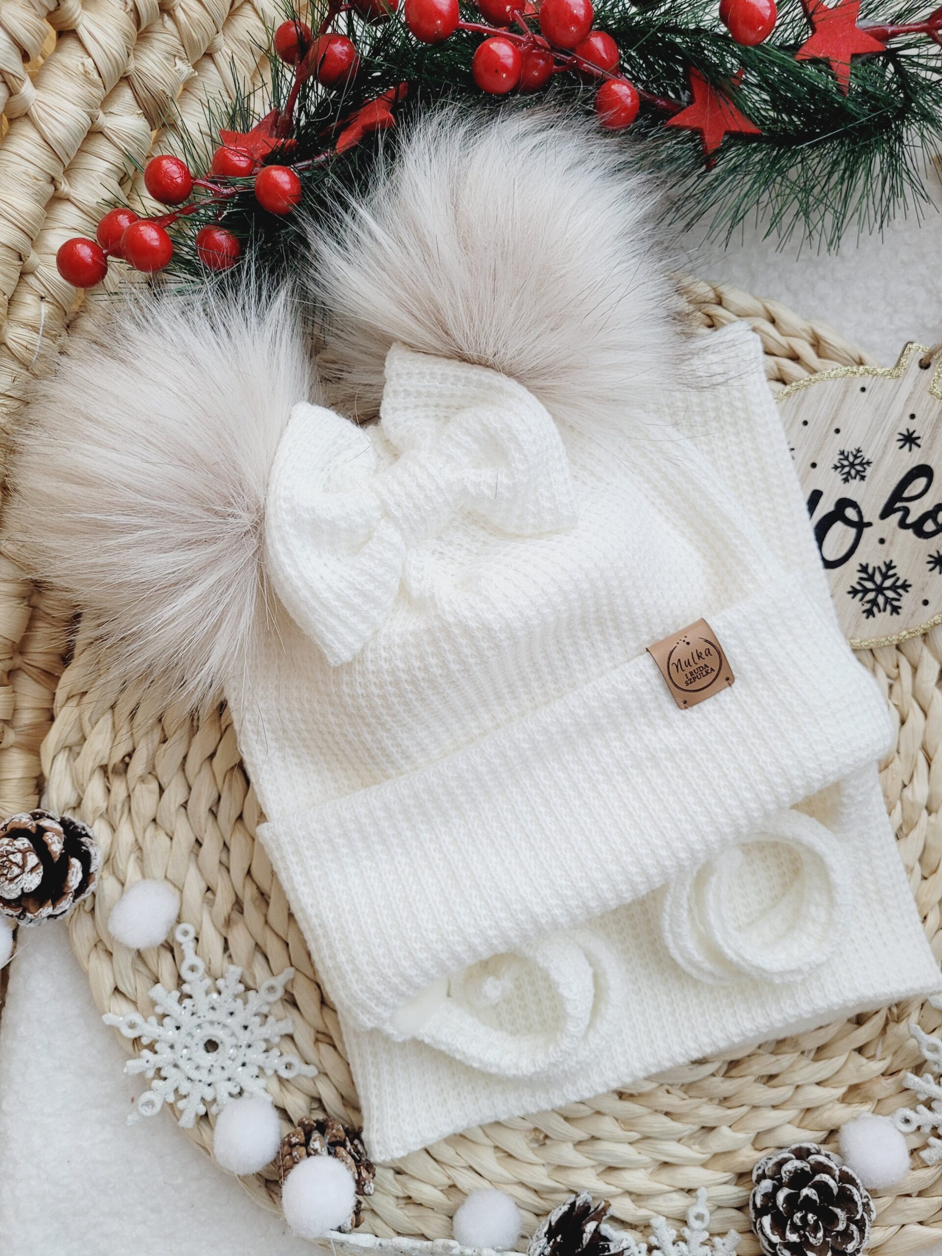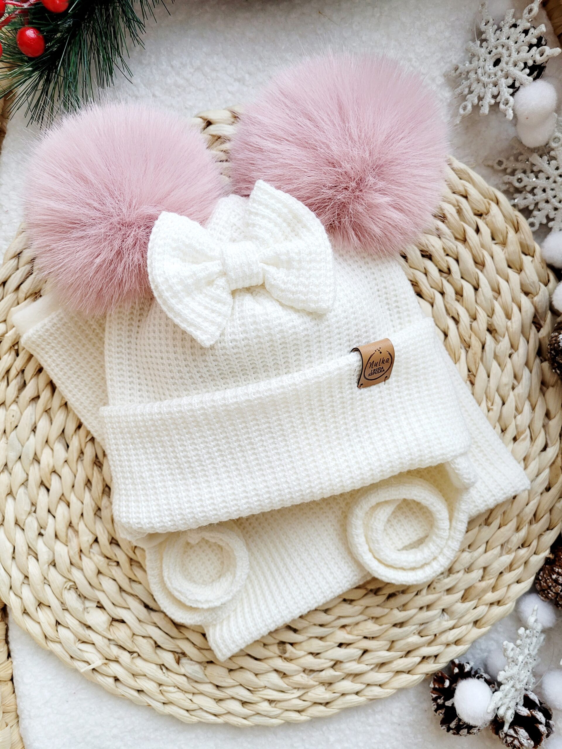 Zimowy komplet dla dziewczynki w wybranym kolorze ozdobiony pomponami i kokardką, rozmiary 36-54.