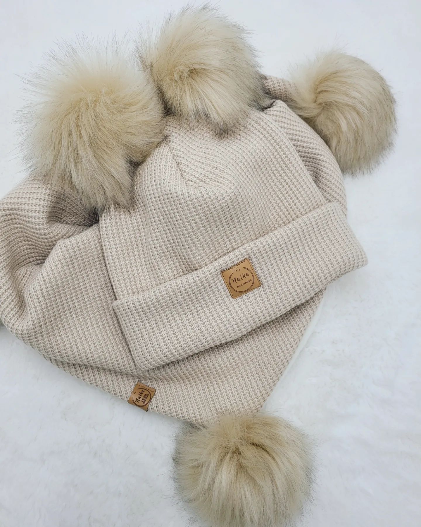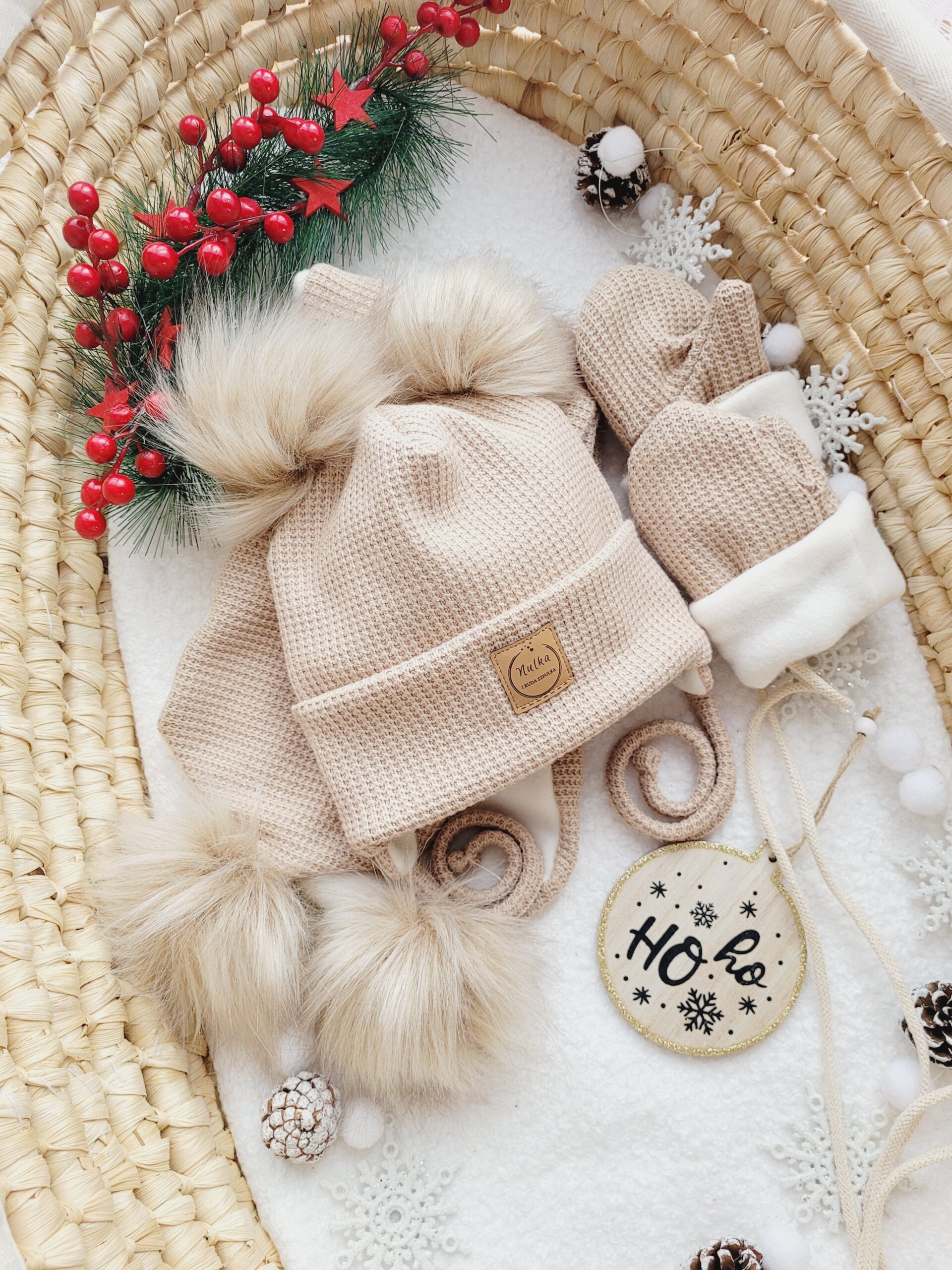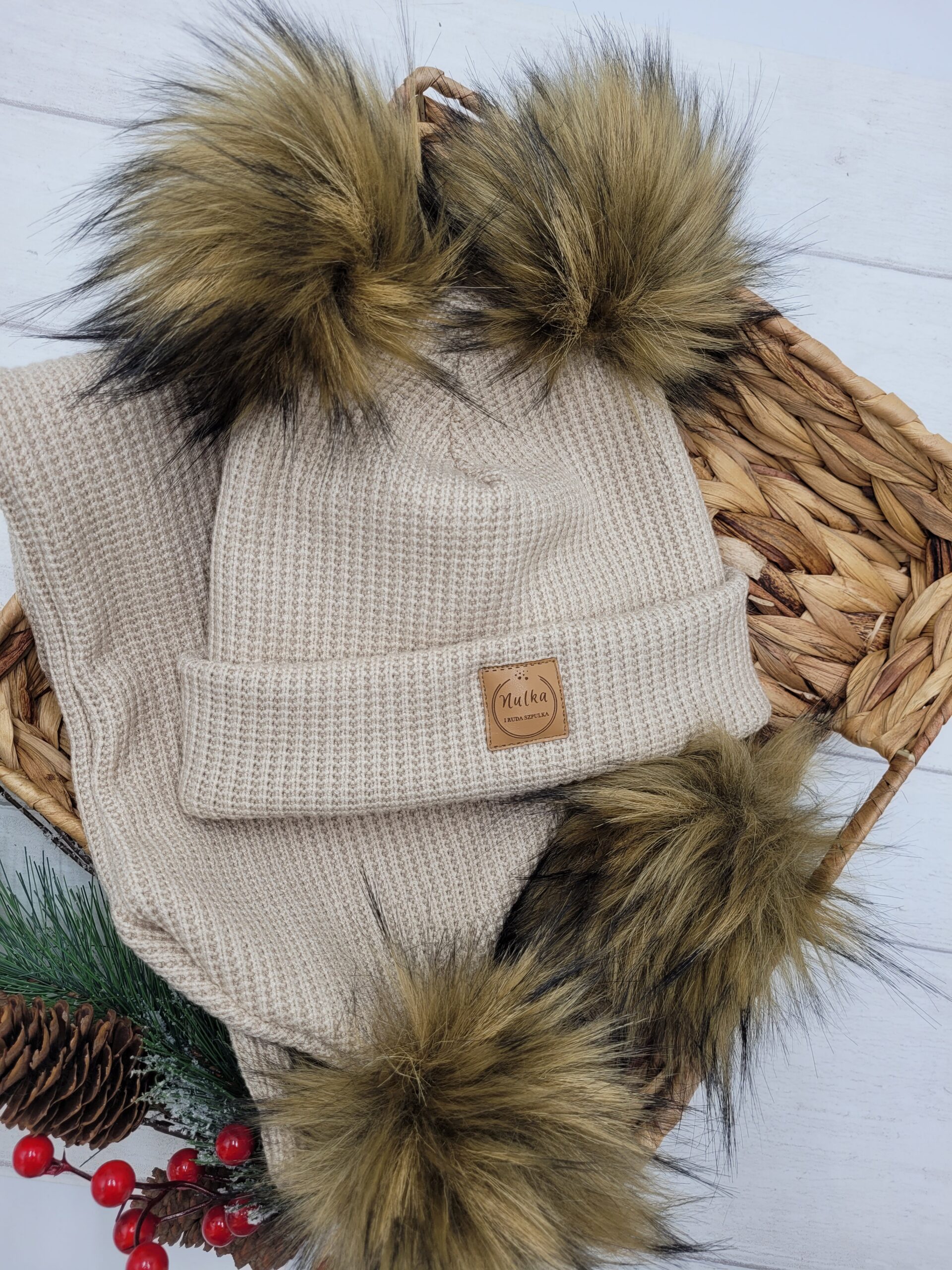 Odkryj nasz uroczy komplet zimowy, stworzony z miękkiej i przyjemnej w dotyku dzianiny sweterkowej w eleganckim beżowym odcieniu. Ten wyjątkowy zestaw doskonale sprawdzi się zarówno dla chłopców, jak i dziewczynek. Czapka w stylu beanie dostępna jest w wersji prostej lub z wywinięciem, a jej ozdobą są ręcznie robione pompony w wybranym przez Ciebie kolorze.