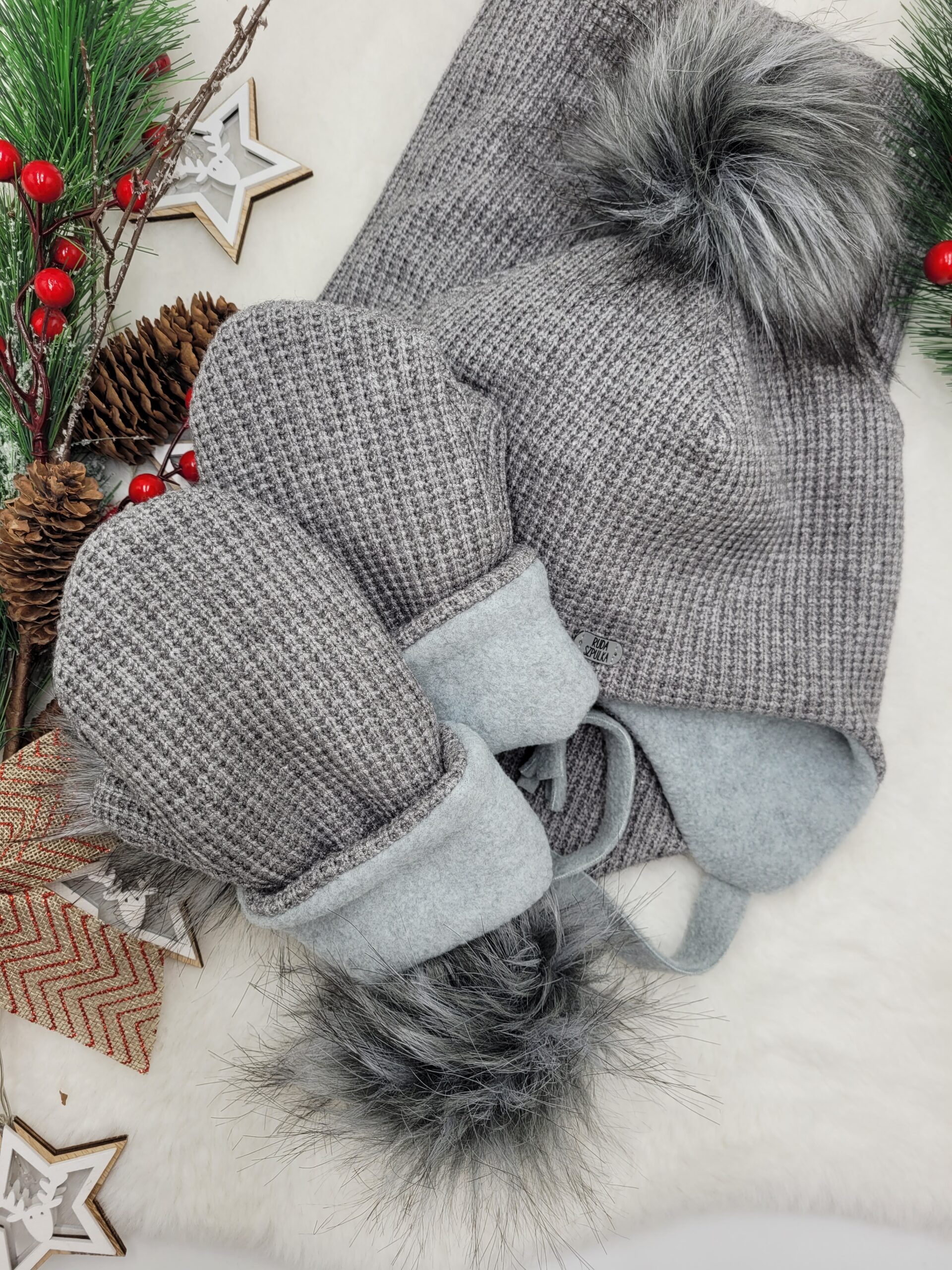 Napisz pierwszą opinię o „Komplet zimowy z pomponami dla dziecka wiązany – szary melanż”