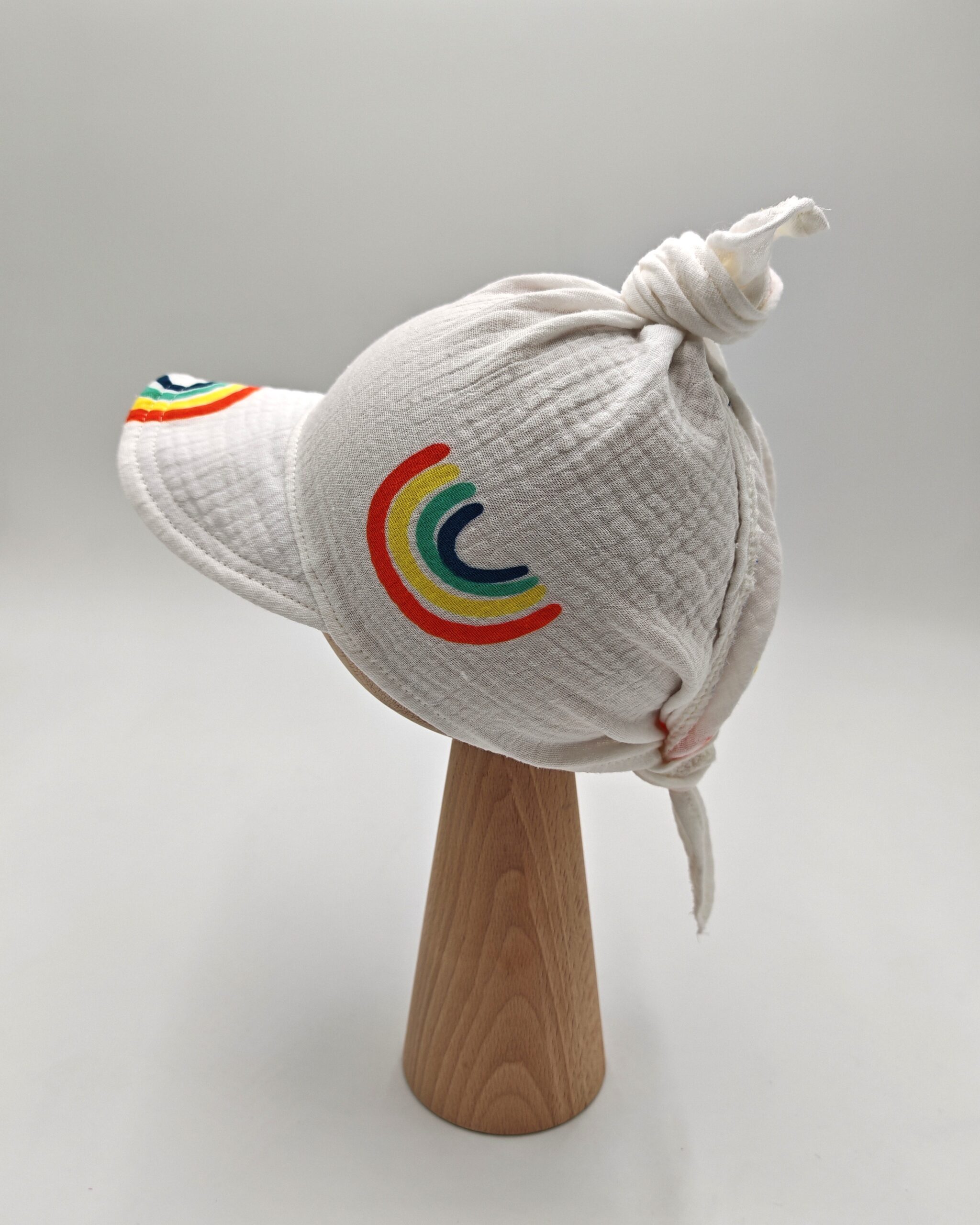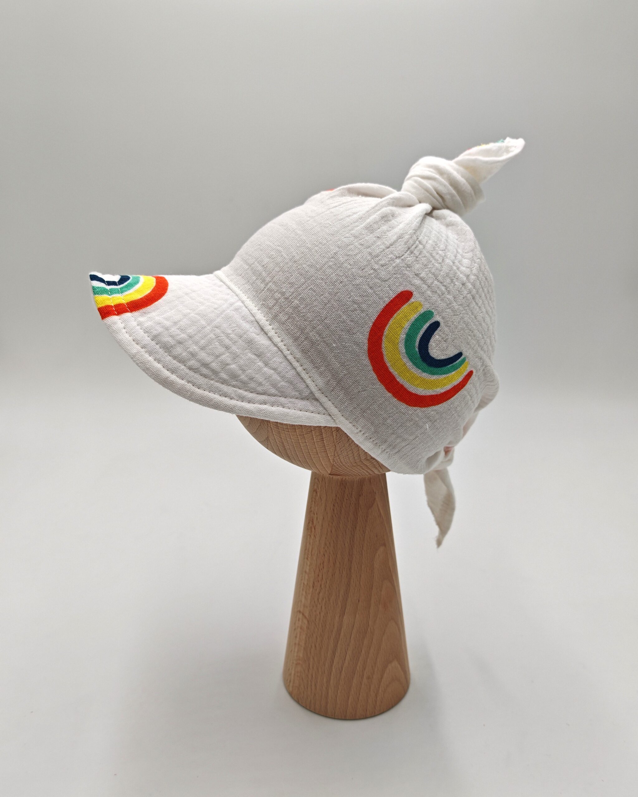 Chustka z daszkiem dla chłopca w tęczowy wzór. Uszyta z muślinu bawełnianego z certyfikatem Oeko-Tex. Lekka, przewiewna i wygodna – idealna na lato!