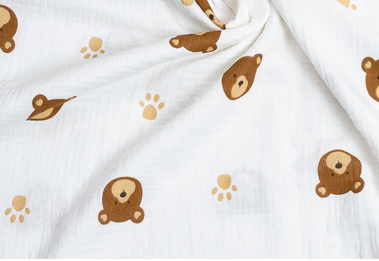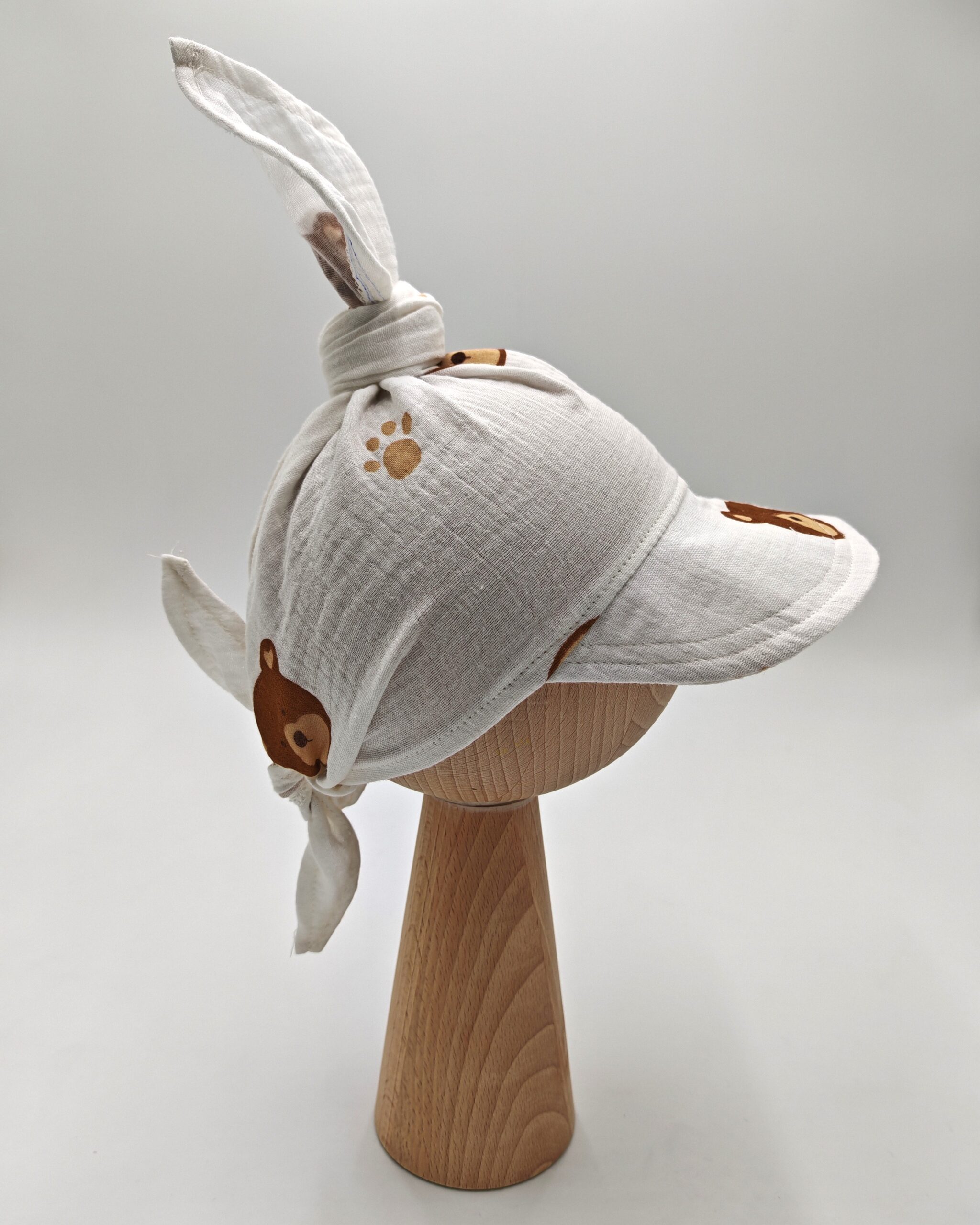 Uszyliśmy tę chustkę z daszkiem z najwyższej jakości muślinu bawełnianego w kolorze ecru, ozdobionego misiami i łapkami. To idealny wybór na ciepłe dni – chustka jest przewiewna, lekka i delikatna dla skóry dzieci i niemowląt.
