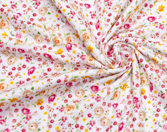 Uszyliśmy tę chustkę z daszkiem z najwyższej jakości muślinu bawełnianego w kolorze ecru, ozdobionego wzorem kwiatowym. To idealny wybór na ciepłe dni – chustka jest przewiewna, lekka i delikatna dla skóry niemowląt i dzieci.