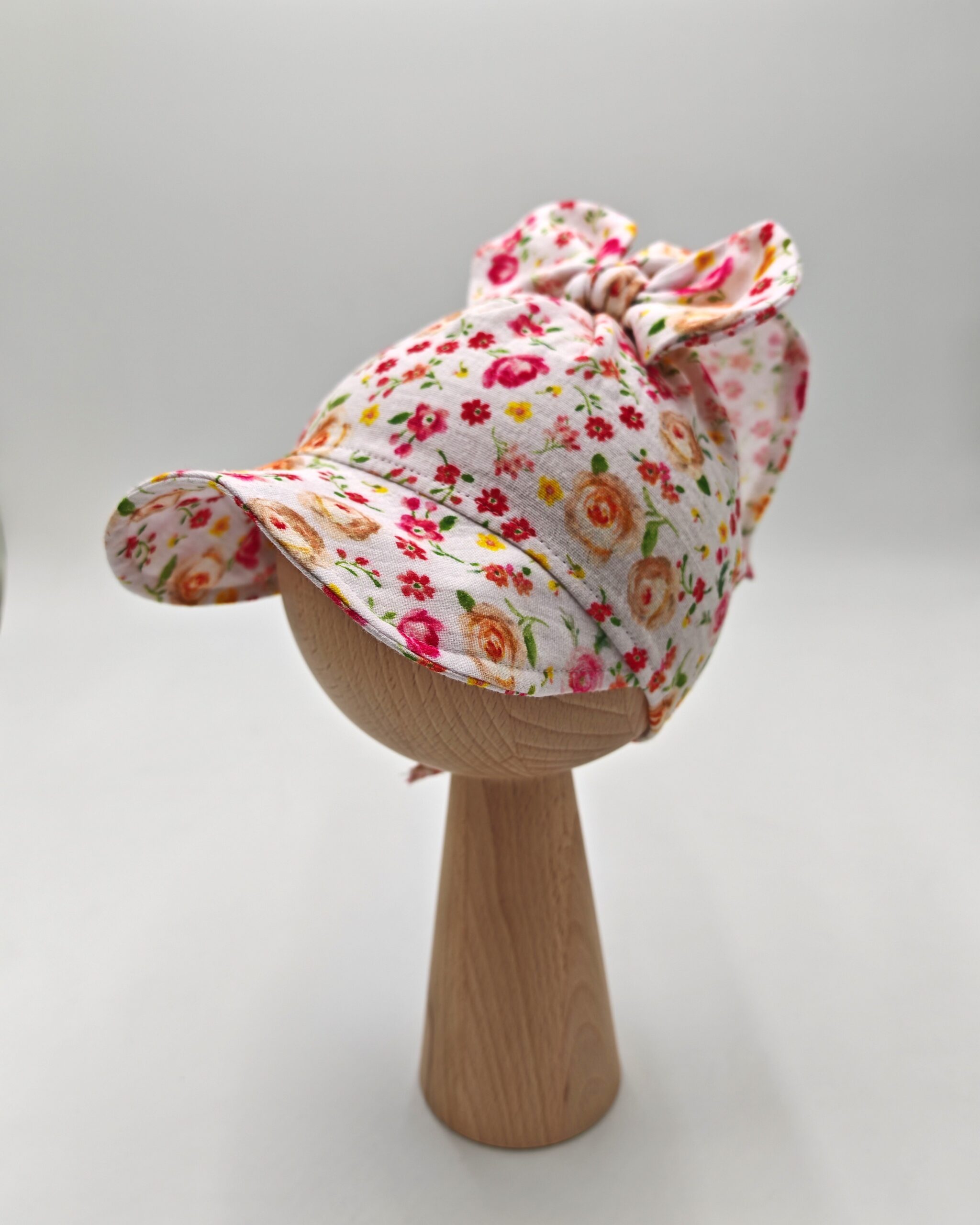 Chustka z daszkiem dla dziewczynki we wzór kwiatowy. Uszyta z muślinu bawełnianego z certyfikatem Oeko-Tex. Lekka, przewiewna i wygodna – idealna na lato!