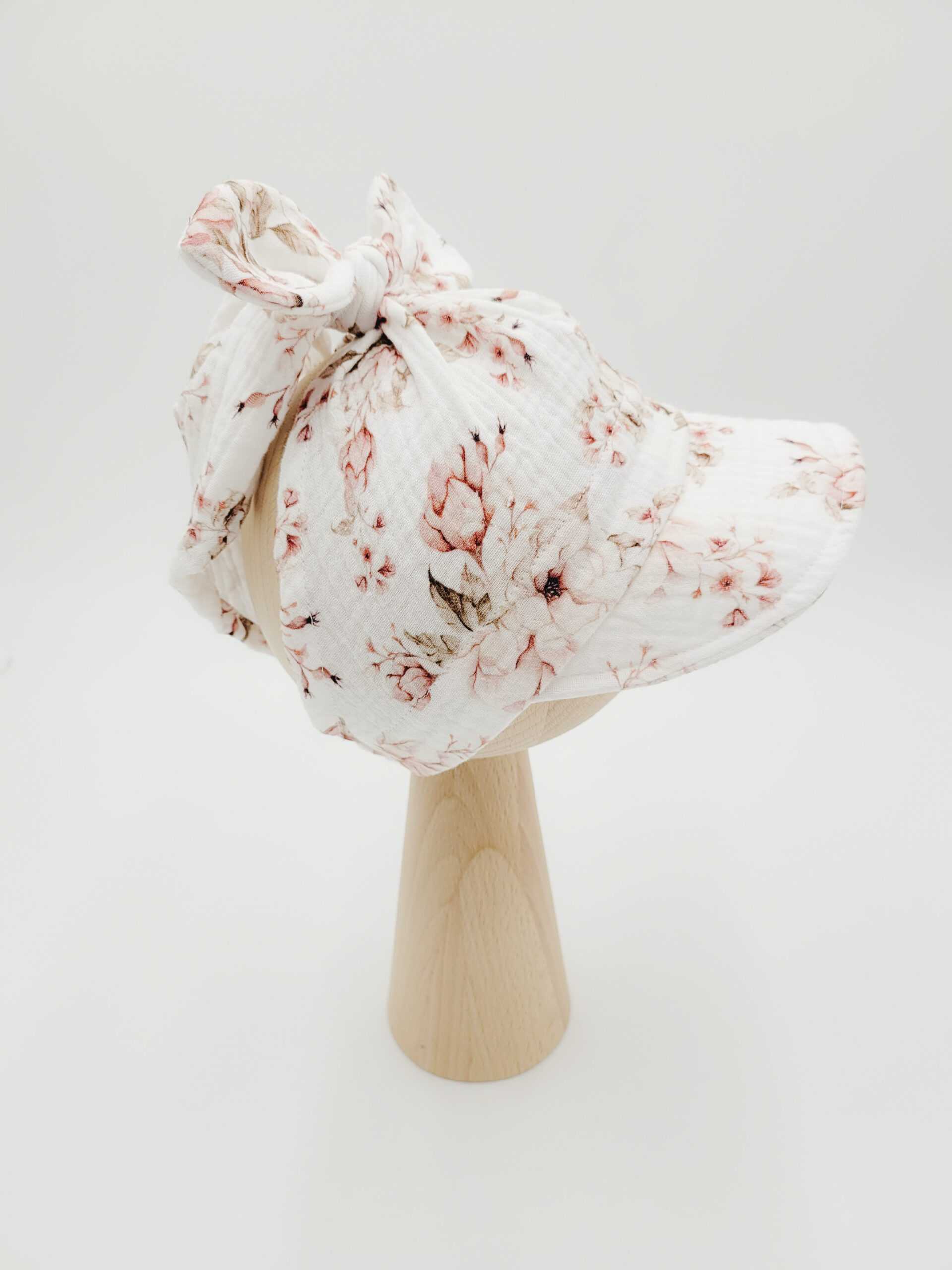 Chusta z daszkiem dla dziewczynki przewiązana kokardką uszyta z muślinu bawełnianego wzór rosie biel – wiązana lub na gumce.