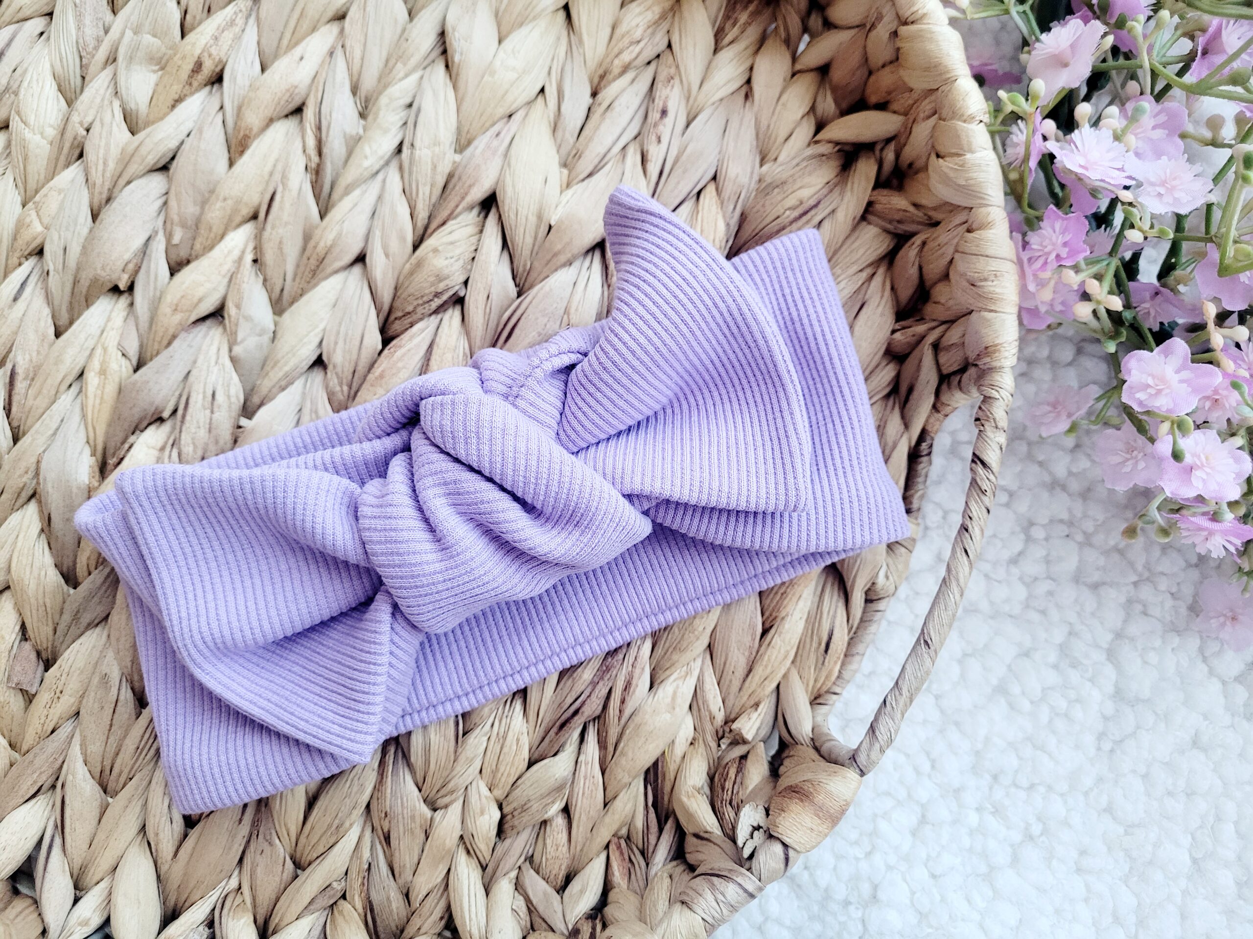 Opaska z wiązaną kokardą wykonana z dzianiny prążkowanej w wybranym kolorze.