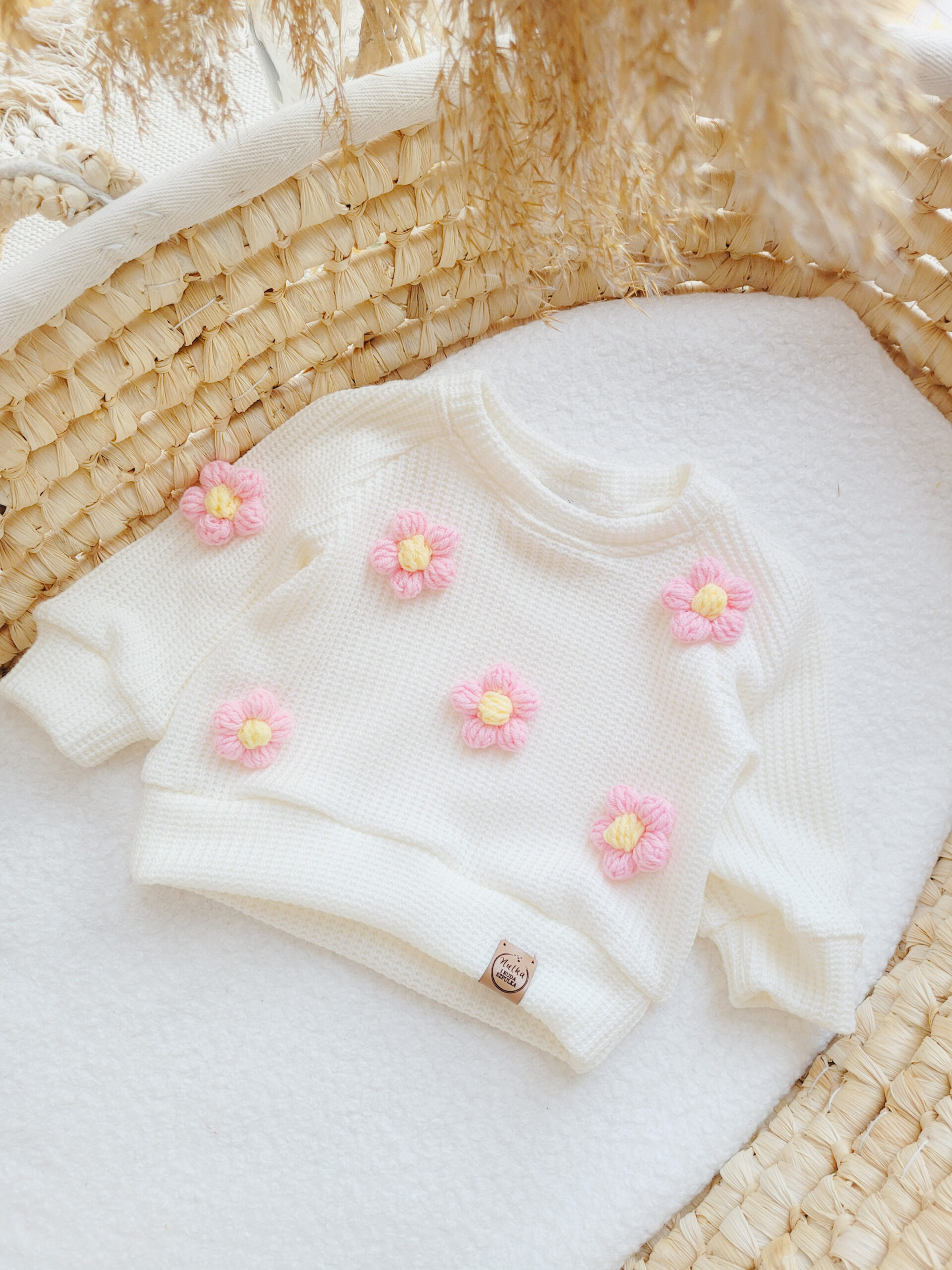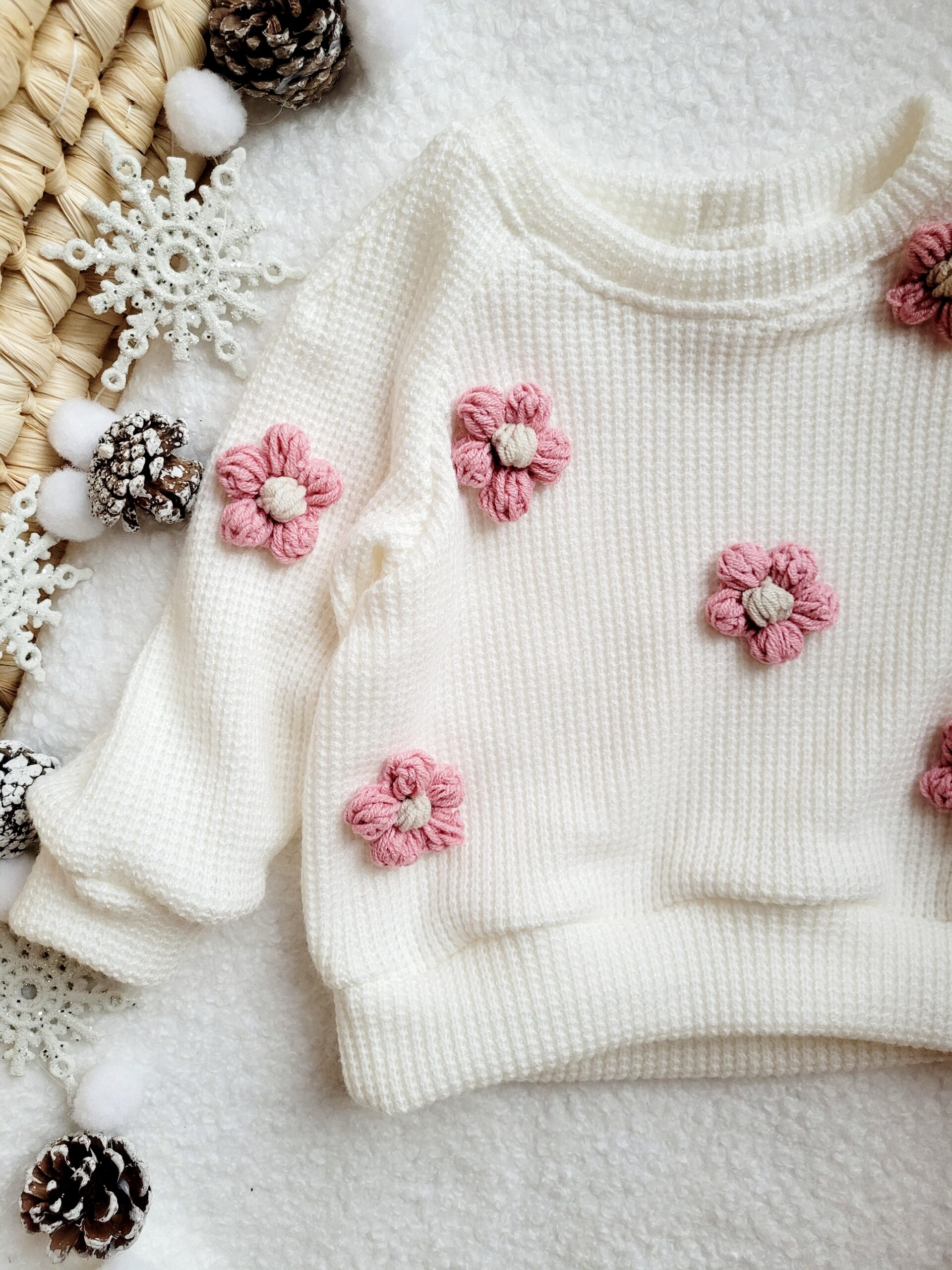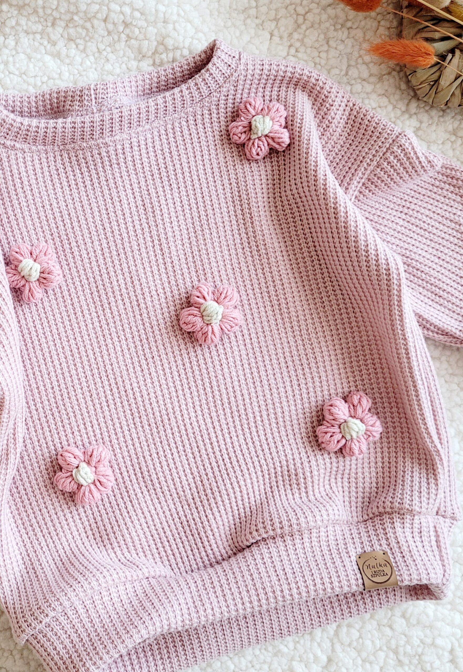 Sweterek dla dziewczynki z kwiatuszkami z włóczki, rozmiary 56-122.
