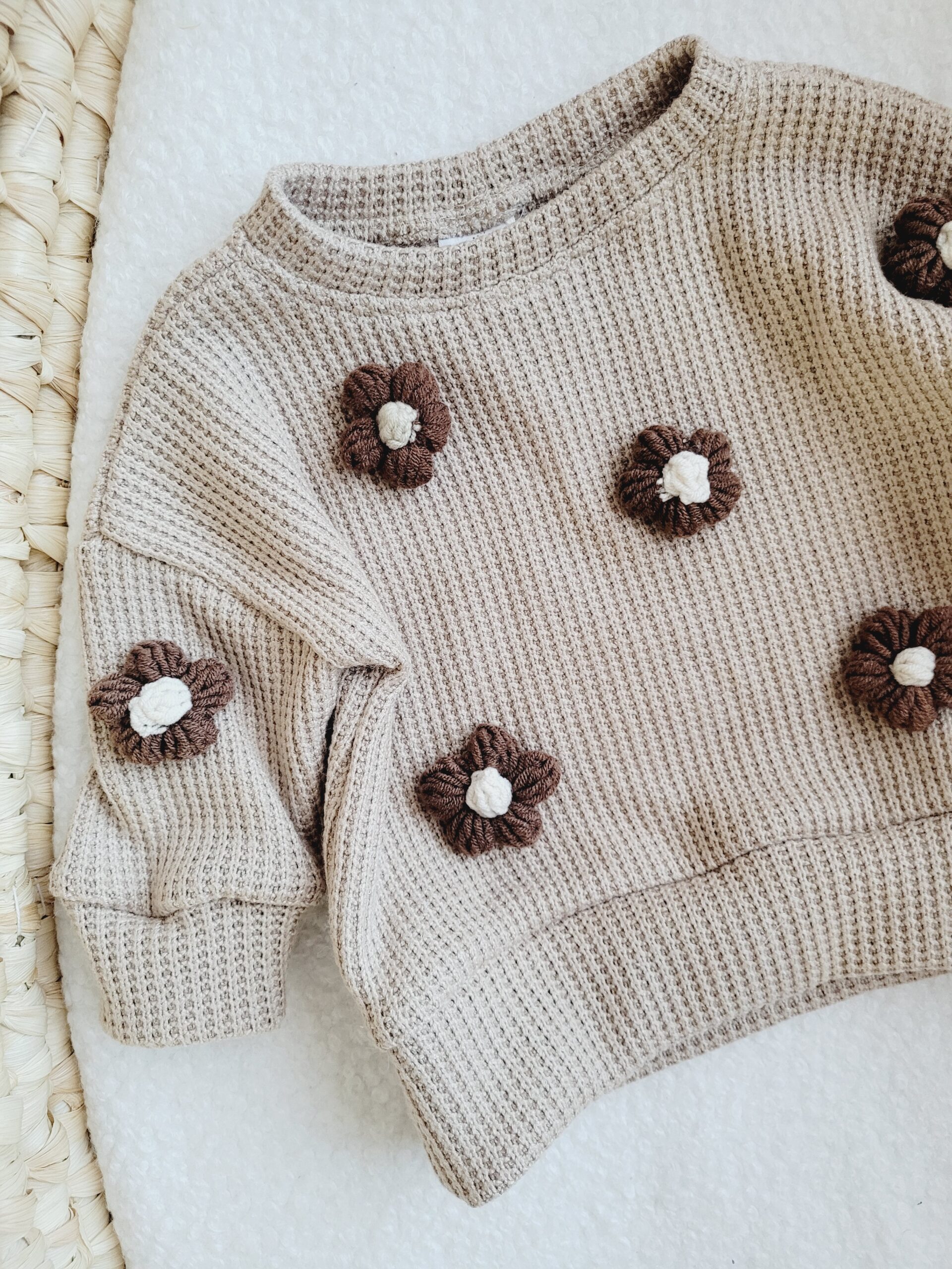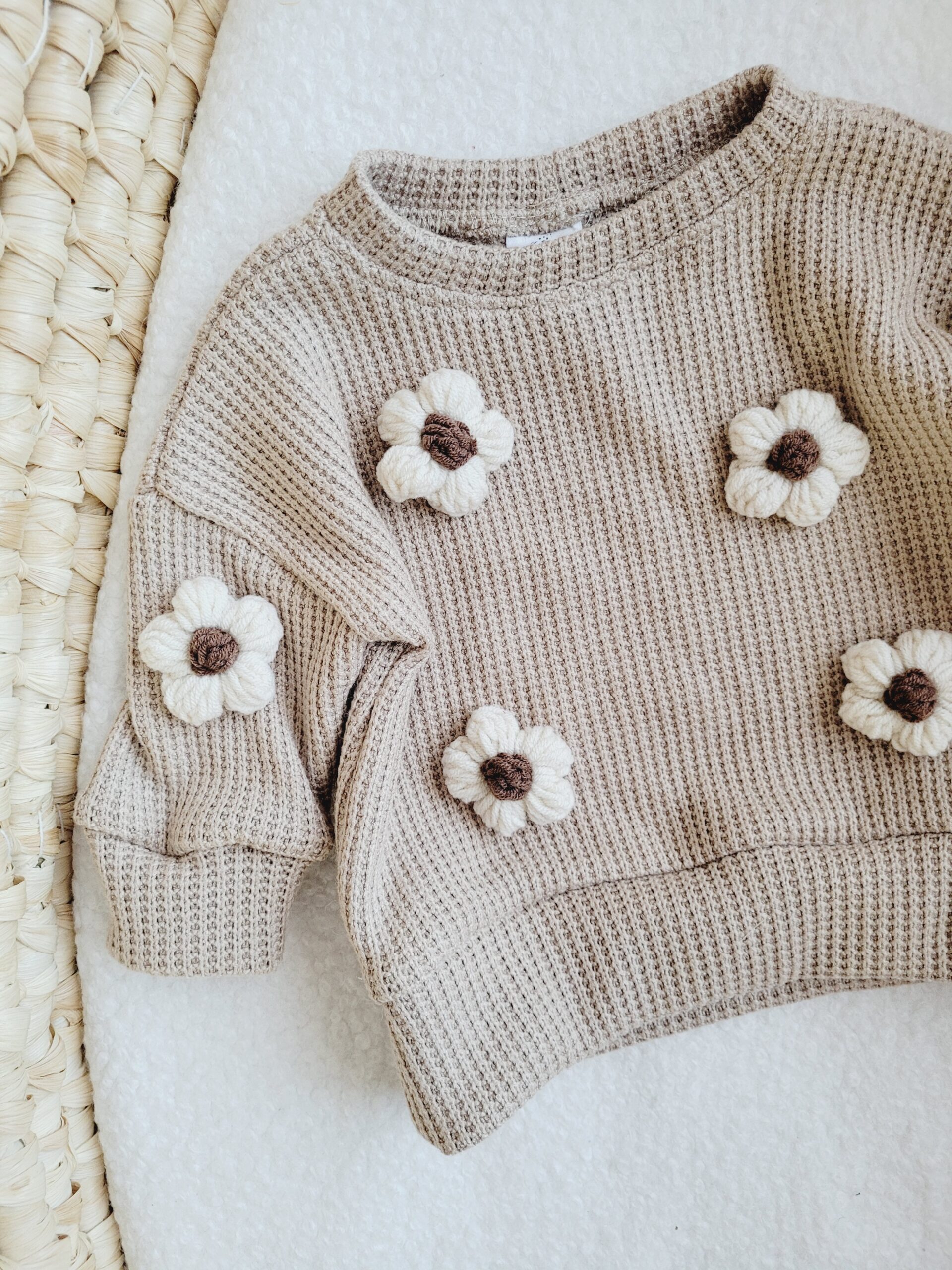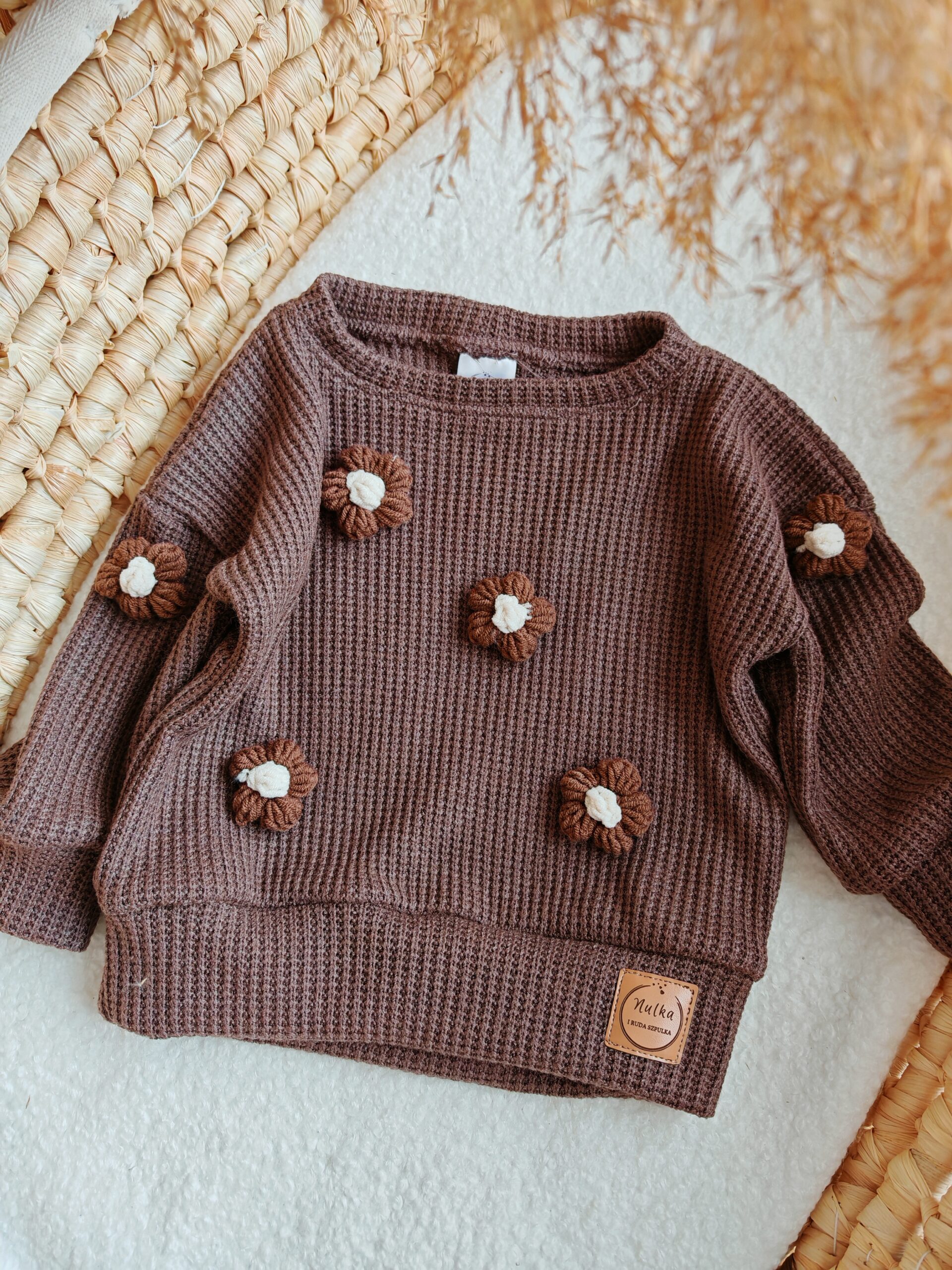 Sweterek dla dziewczynki z kwiatuszkami z włóczki, rozmiary 56-122.