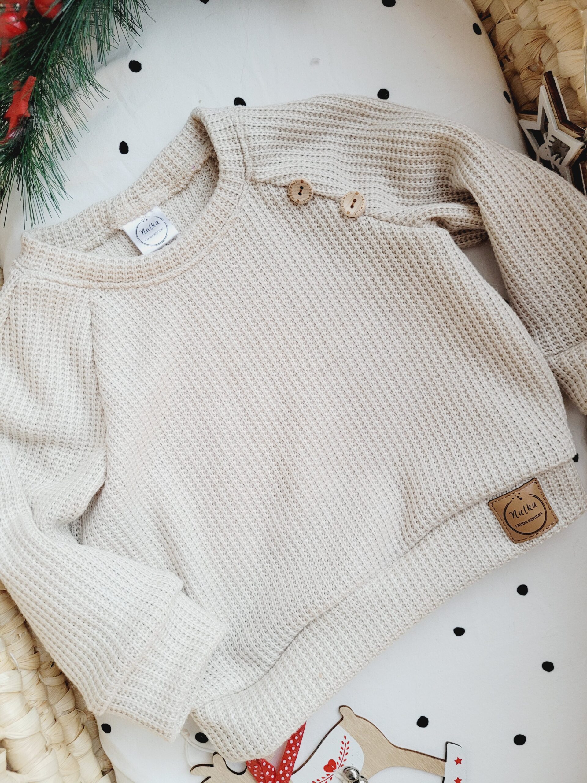 Sweterek o klasycznym kroju, wykonany z niezwykle miękkiej dzianiny sweterkowej. Ozdobiliśmy go dwoma drewnianymi guzikami. Jest nie tylko wygodny, ale i łatwy do założenia przez głowę, co czyni go idealnym wyborem dla najmniejszych dzieci. Klasyczny krój z rękawem raglanowym oraz stonowane kolory idealna baza do wielu różnych stylizacji i okazji.
