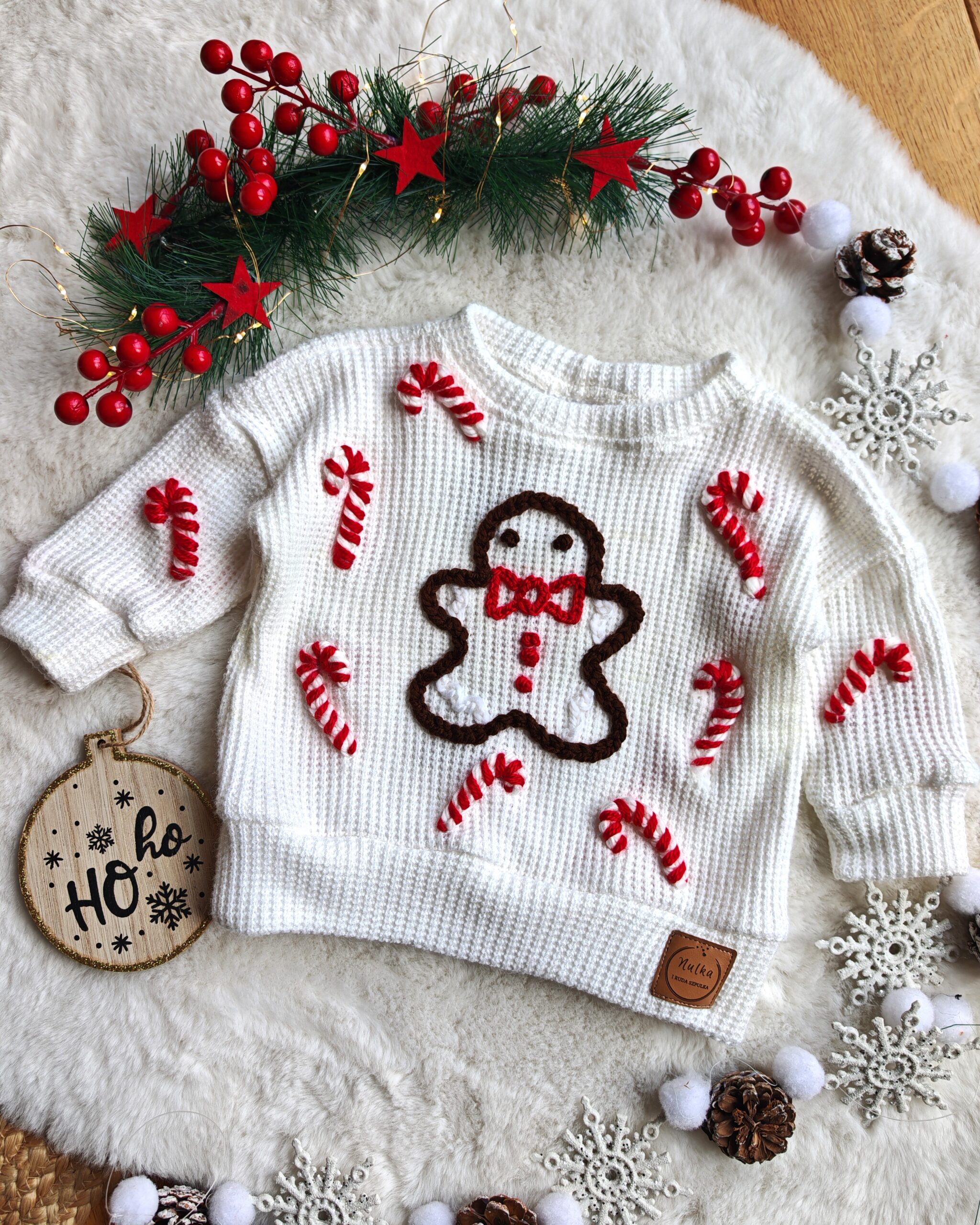 Centralnym motywem sweterka jest słodki ludzik z piernika, otoczony laskami cukrowymi w biało-czerwonych barwach. Haft wykonany jest ręcznie, z niezwykłą precyzją i dbałością o każdy detal. To trwała, efektowna ozdoba, która przyciąga uwagę i sprawia, że sweterek wygląda wyjątkowo uroczo.