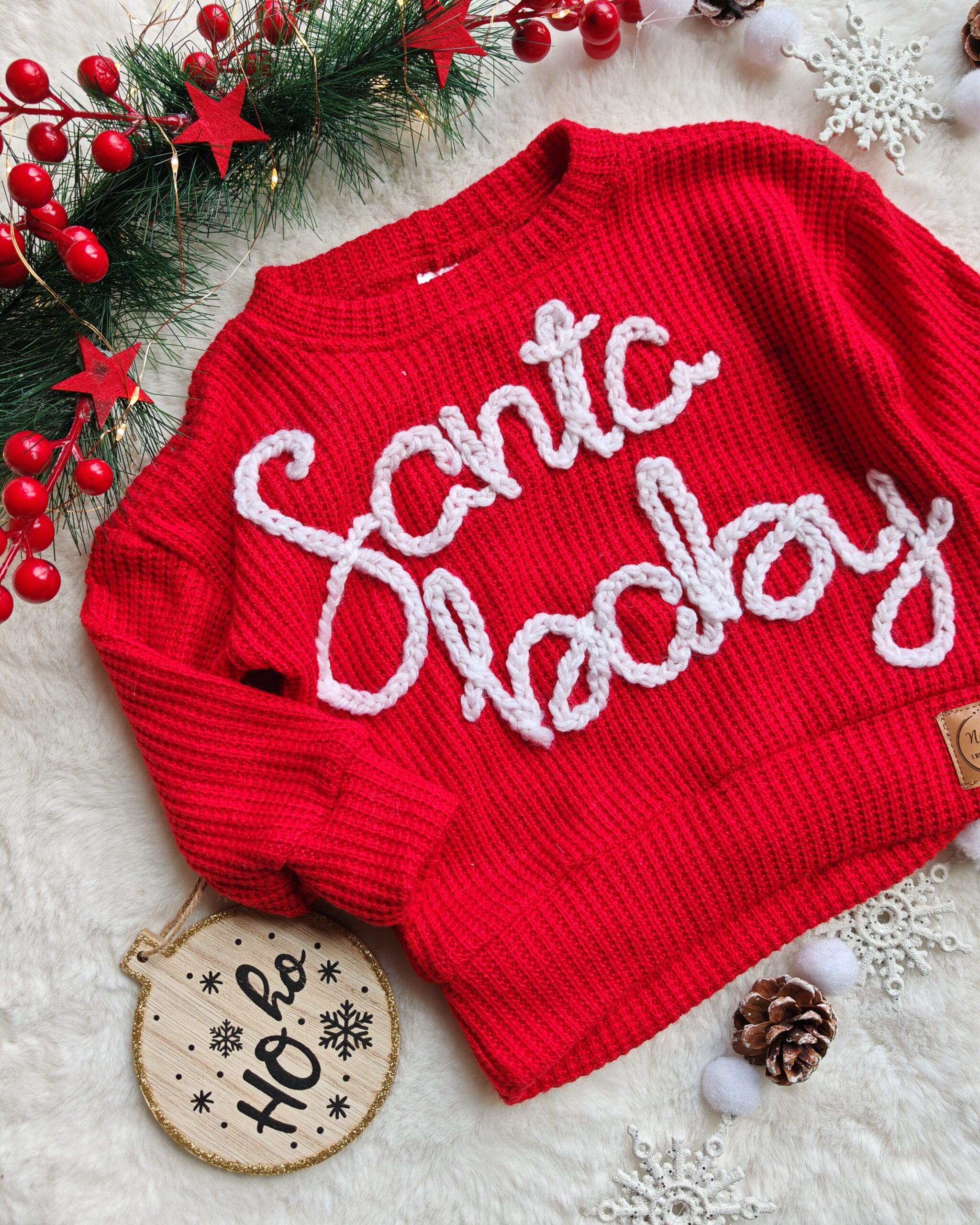 Każdy sweterek zdobi ręcznie haftowany napis „Santa Baby”, który nadaje mu świątecznego charakteru.