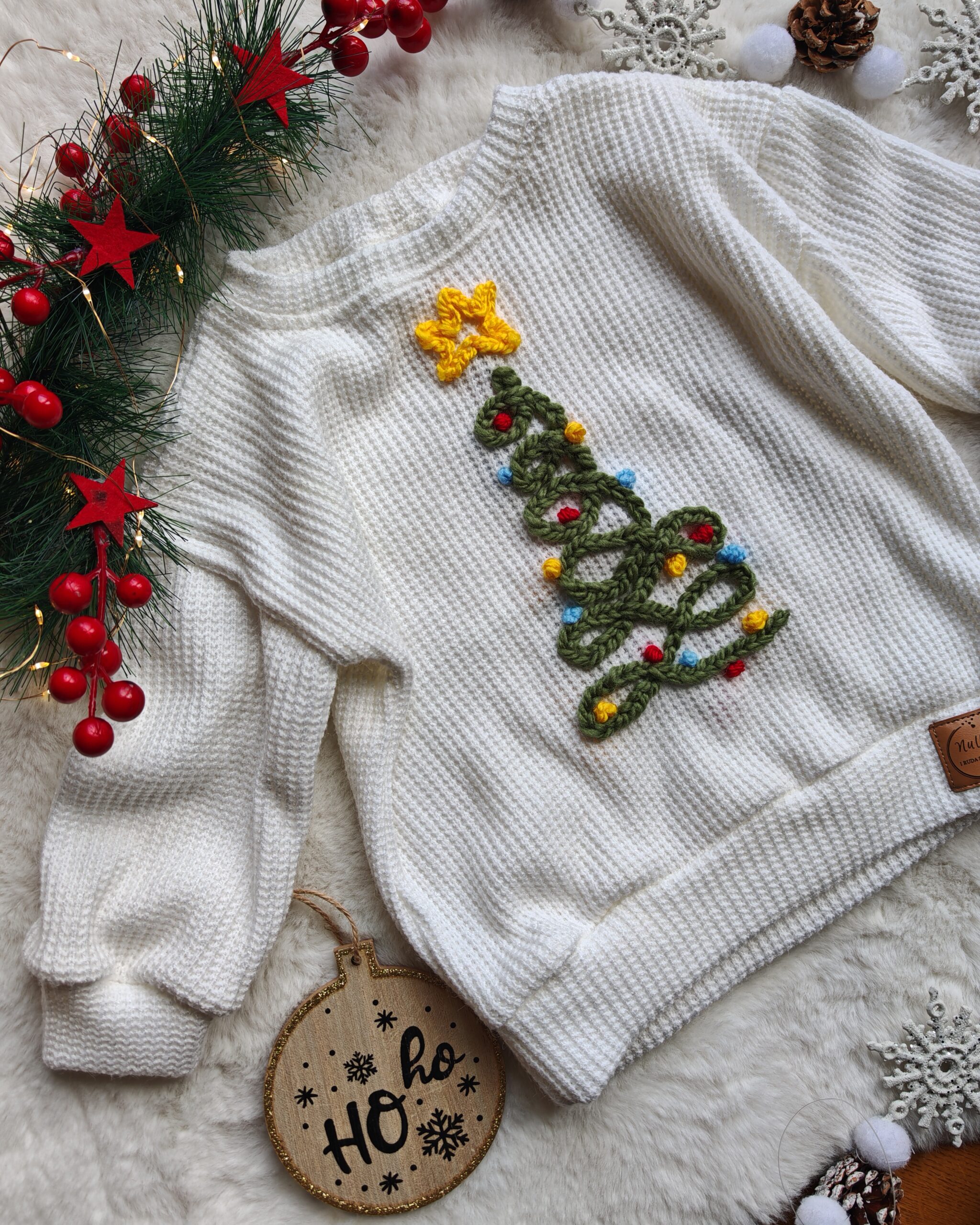Ręcznie szyty sweterek świąteczny z haftowaną choinką. Miękka dzianina, kolor ecru, rozmiary 56–122. Idealny na świąteczne dni i zdjęcia rodzinne.
