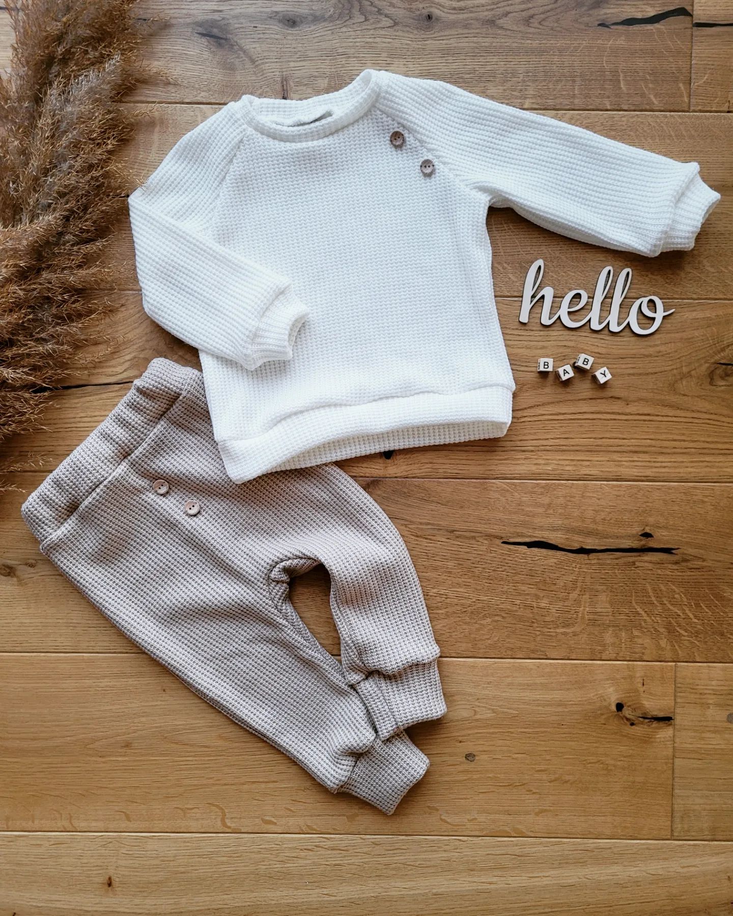Przepiękny komplet dla chłopca lub dziewczynki wykonany z miękkiej dzianiny sweterkowej. Sweterek i spodnie są ozdobione dwoma drewnianymi guzikami, co nadaje im uroku i dodatkowego uroku. Sweterek łatwo nakłada się przez głowę, co sprawia, że jest wygodny nawet dla niemowlaka. Produkt odpowiedni zarówno na jesień i wiosnę, jak i na chłodniejsze dni zimowe.