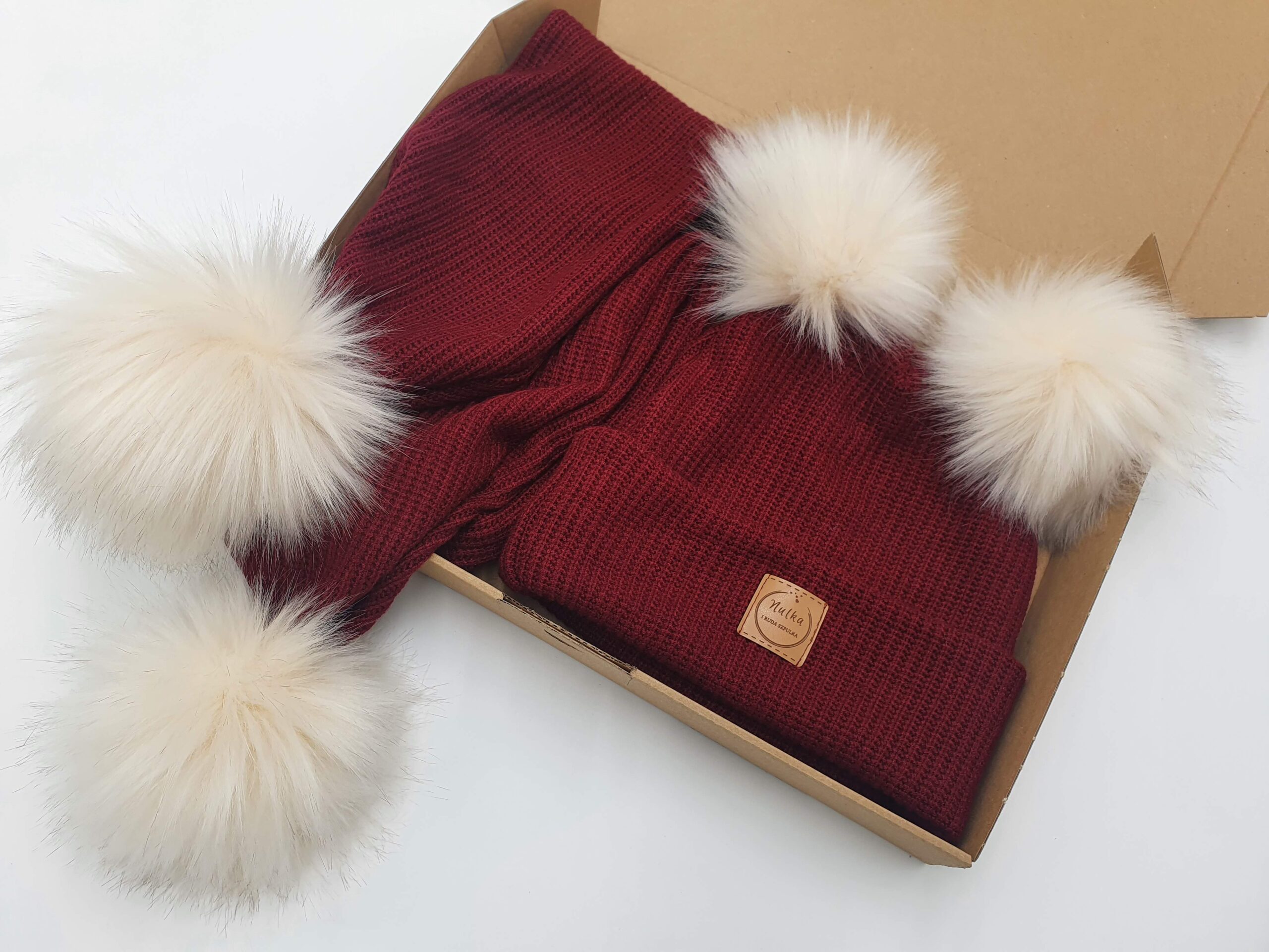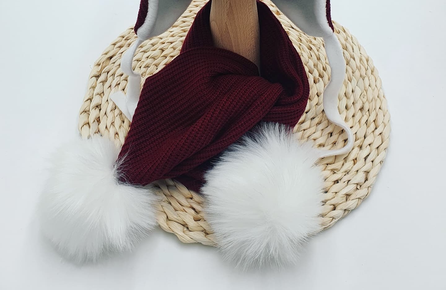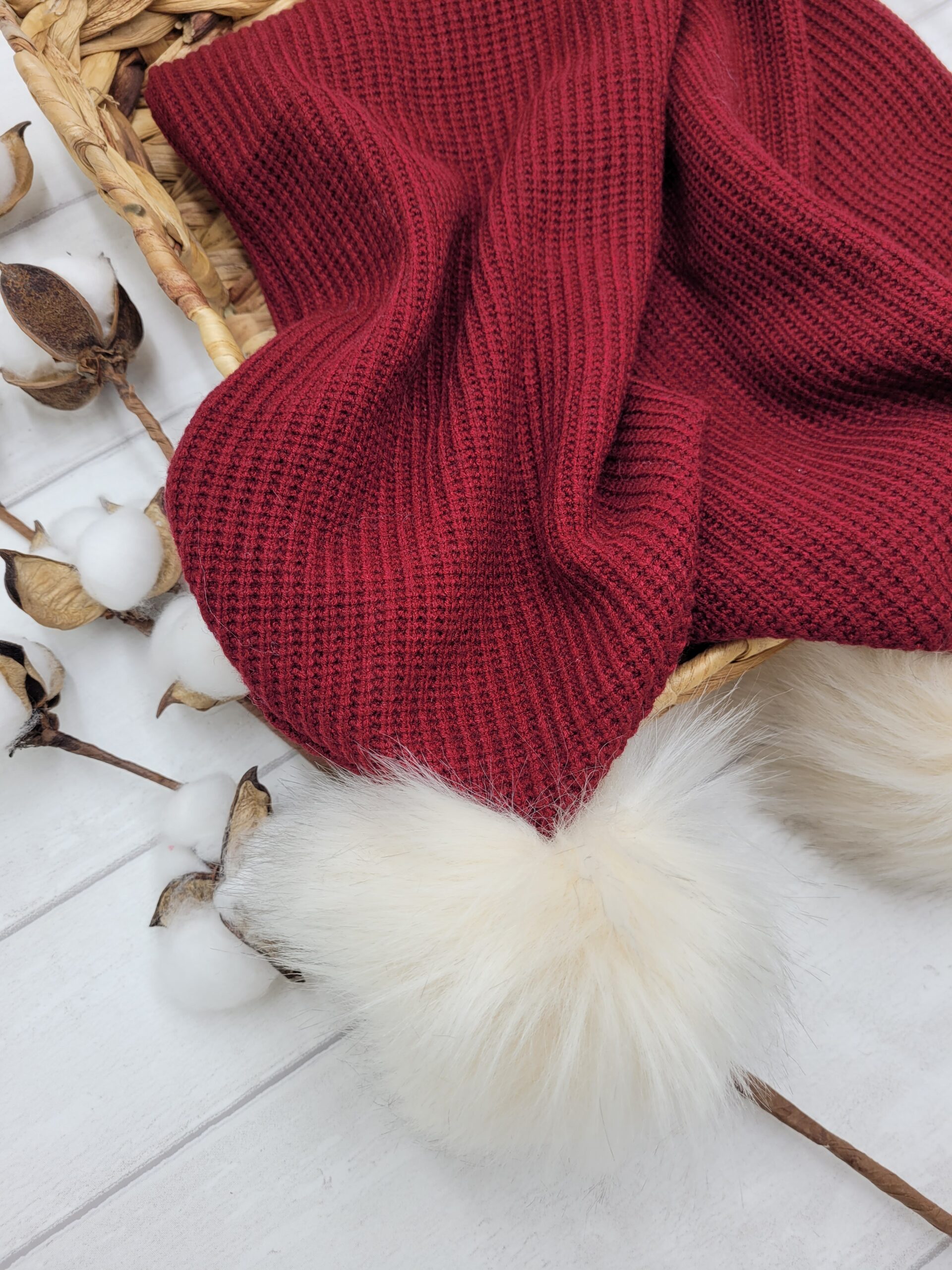 Szalik z dzianiny sweterkowej ozdobiony pomponami w kolorze bordowym. Różne długości do wyboru.