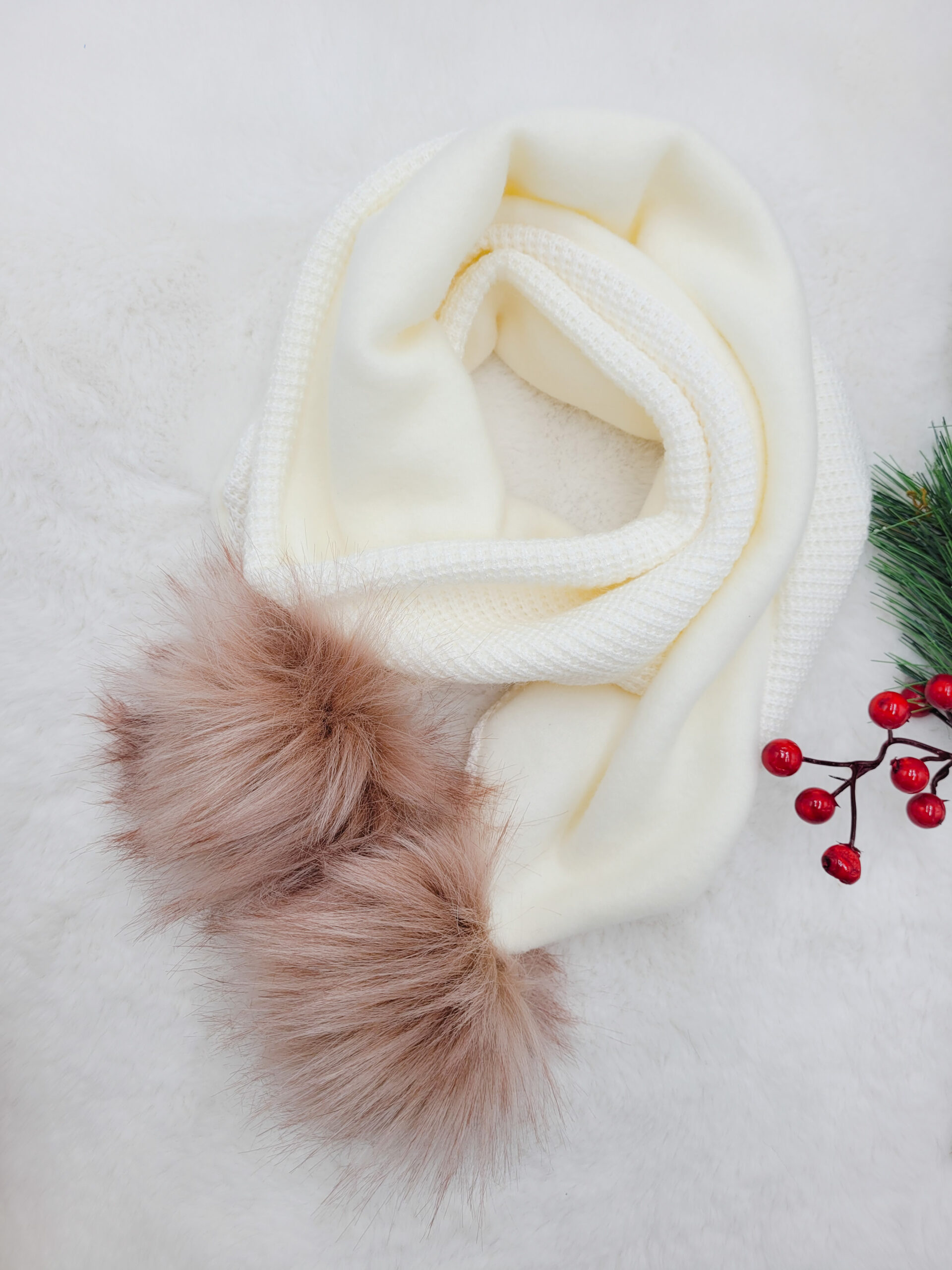 Ecru szalik pasuje zarówno chłopcom, jak i dziewczynkom. Neutralne kolory łatwo zestawisz z różnymi odcieniami zimowych kurtek i innych akcesoriów.