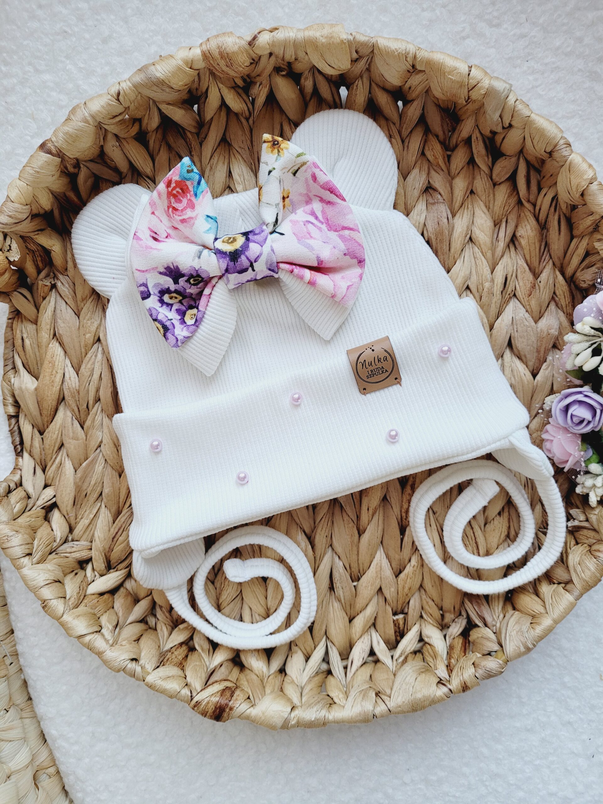 Czapka prążkowana dla dziewczynki ozdobiona misiowymi uszkami i kokardką wzór różane kwiaty, piękne perełki na wywinięciu. W wersji zimowej podszyta ciepłym polarem.