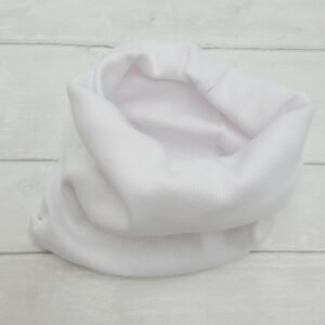 Komin z białej dzianiny prążkowanej – klasyczny prosty lub zakręcony. Możliwość podszycia polarem.