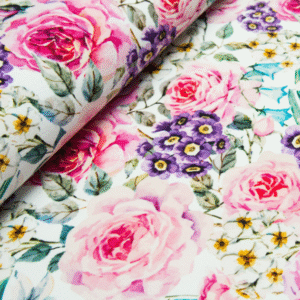Czapka prążkowana dla dziewczynki ozdobiona misiowymi uszkami i kokardką wzór różane kwiaty, piękne perełki na wywinięciu. W wersji zimowej podszyta ciepłym polarem.