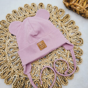Czapka z dzianiny prążkowanej ozdobiona misiowymi uszami w kolorze pastelowego różu. Możliwe wiązanie i dodatkowe kokardki.