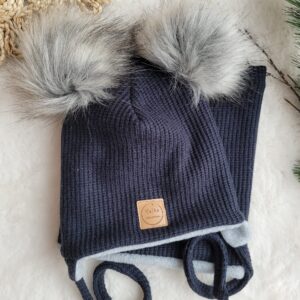 Ozdobiona pomponami czapka z dzianiny sweterkowej w granatowym kolorze.