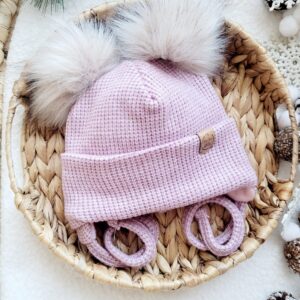 Czapka wiązana dla dziewczynki w kolorze pastelowy róż z jednym lub dwoma pomponami do wyboru. Rozmiary 36-52.