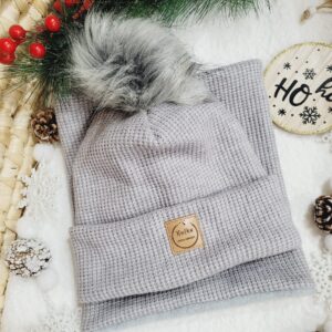 Rozmiary od 36 do 56. Czapka z dzianiny sweterkowej w kolorze szarym ozdobiony pomponami, możliwość podszycia polarem.