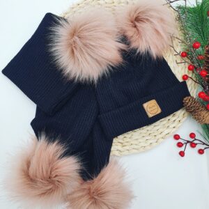 Wiązany komplet z pomponami z dzianiny sweterkowej w granatowym kolorze.