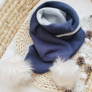 Szalik dziecięcy z dzianiny sweterkowej ozdobiony pomponami w kolorze granatowym. Różne długości do wyboru.