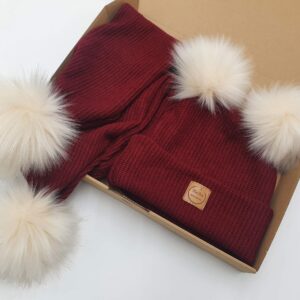 Szalik z dzianiny sweterkowej ozdobiony pomponami w kolorze bordowym. Różne długości do wyboru.