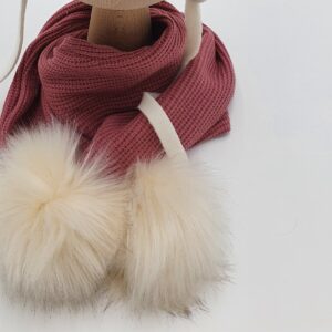 Szalik z dzianiny sweterkowej w kolorze ecru wykończony ręcznie robionymi pomponami w wybranym kolorze. Dostępny w różnych długościach.
